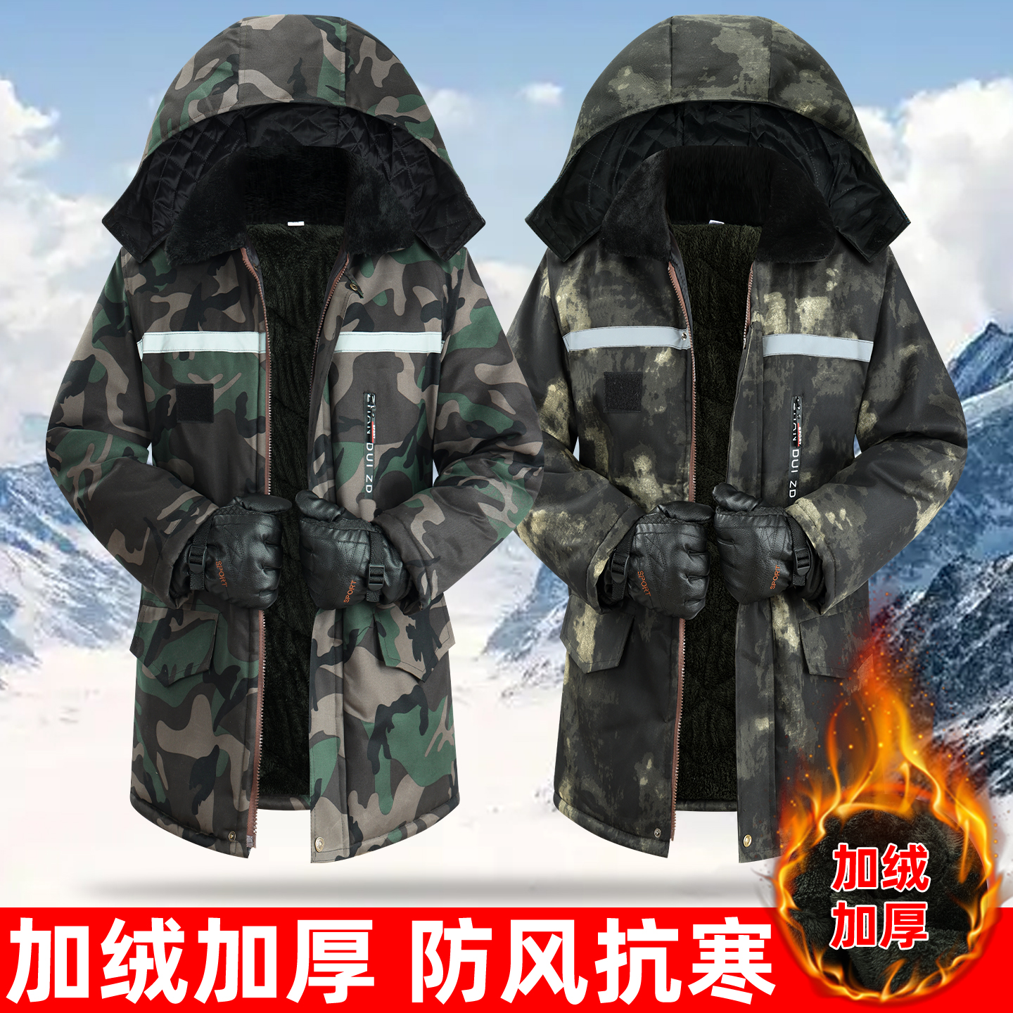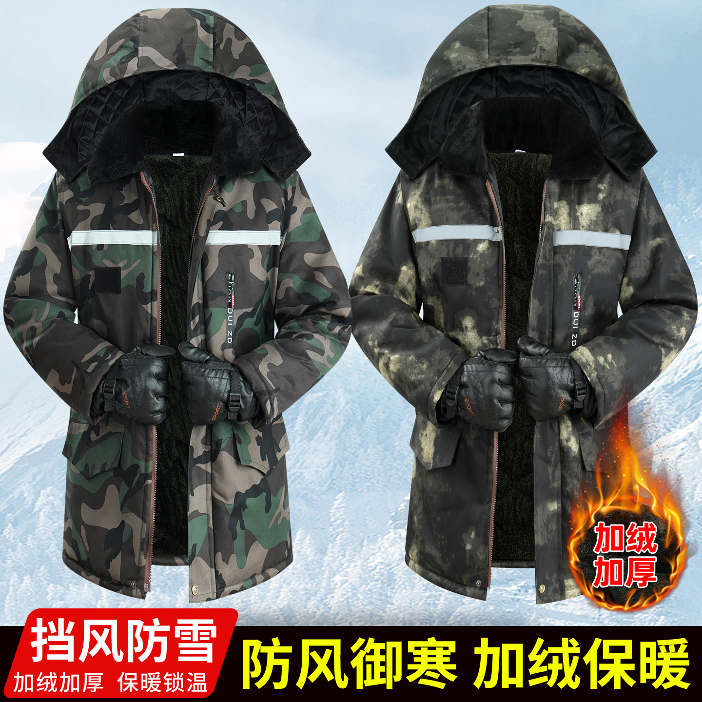 冬季加绒迷彩棉袄棉大衣男劳保棉服防寒加厚中长款冷库工作服棉衣