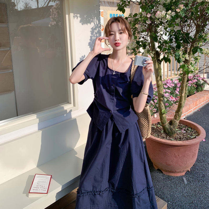 您的位置:他他商城  >   >  藏青色设计感泡泡袖衬衫套装裙女2025夏季木耳边拼接半身裙两件套