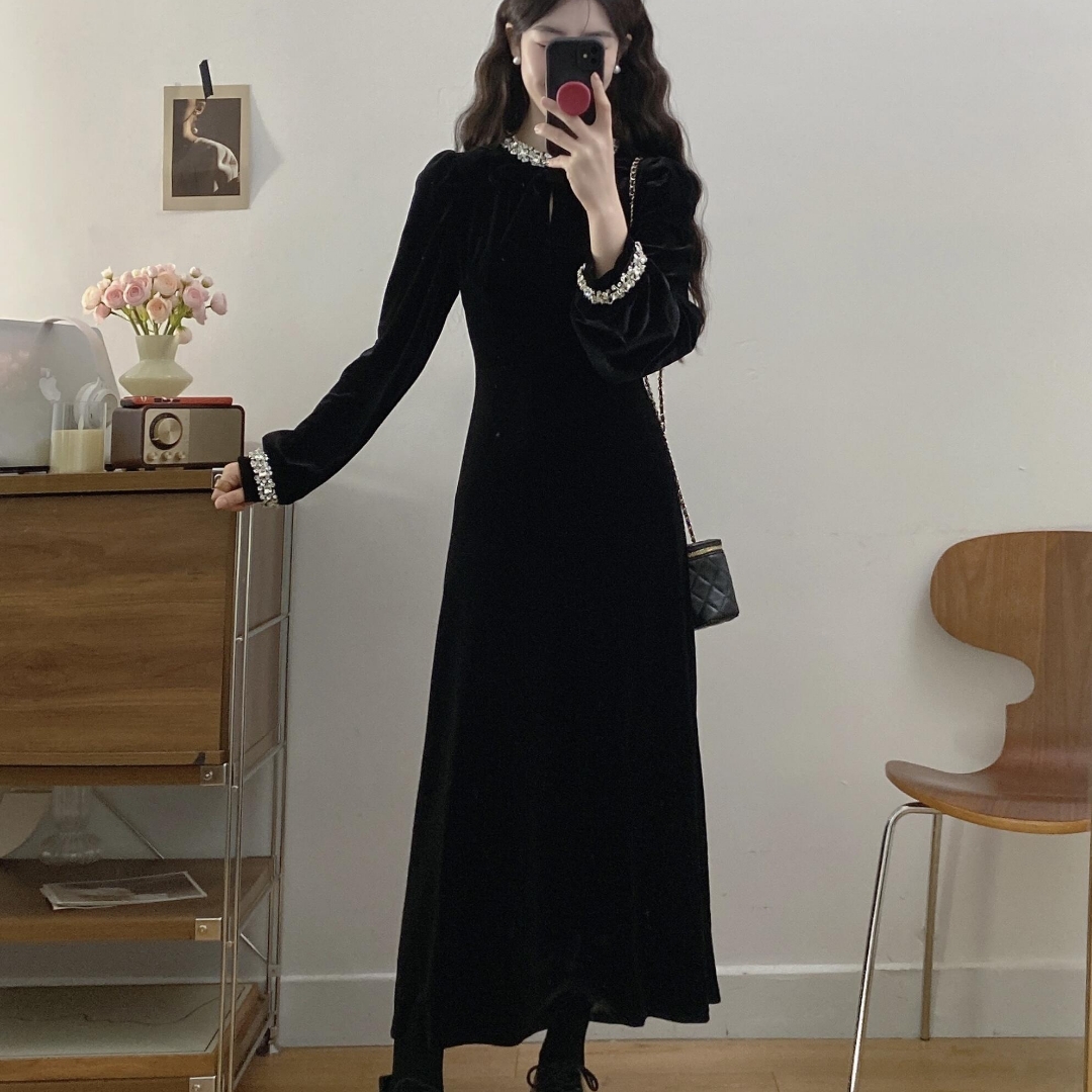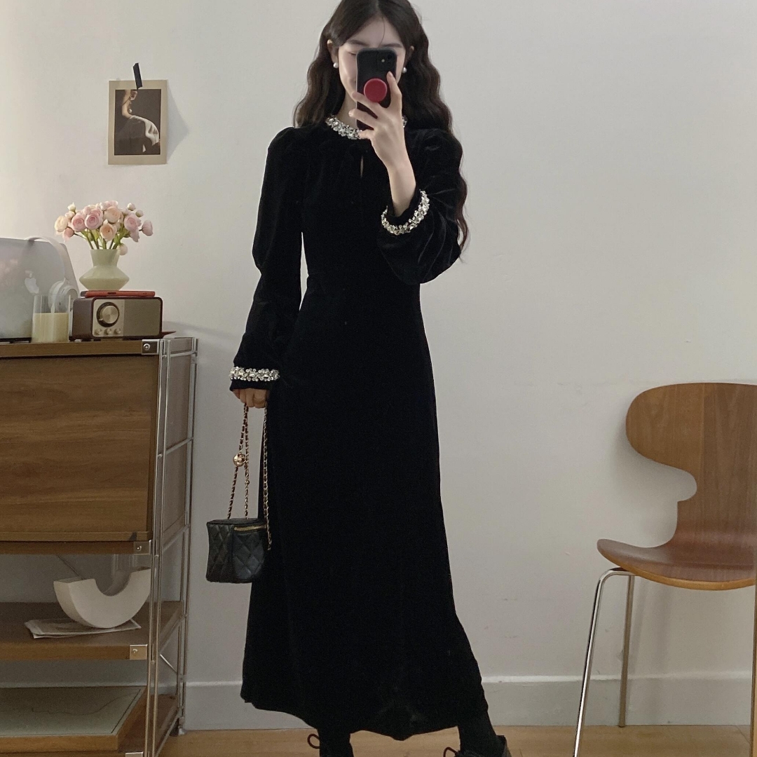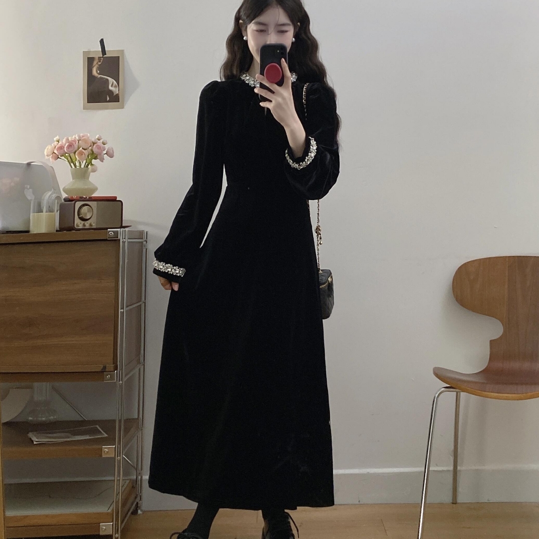实拍大码 星河璀璨气质名媛千金风黑色丝绒连衣裙秋冬 - 轩轩优选服饰