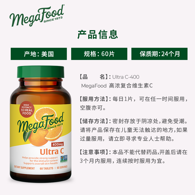 MegaFood天然维生素C400mg高剂量高浓维他命VC片抵抗力免疫力60片 - MegaFood海外旗舰店