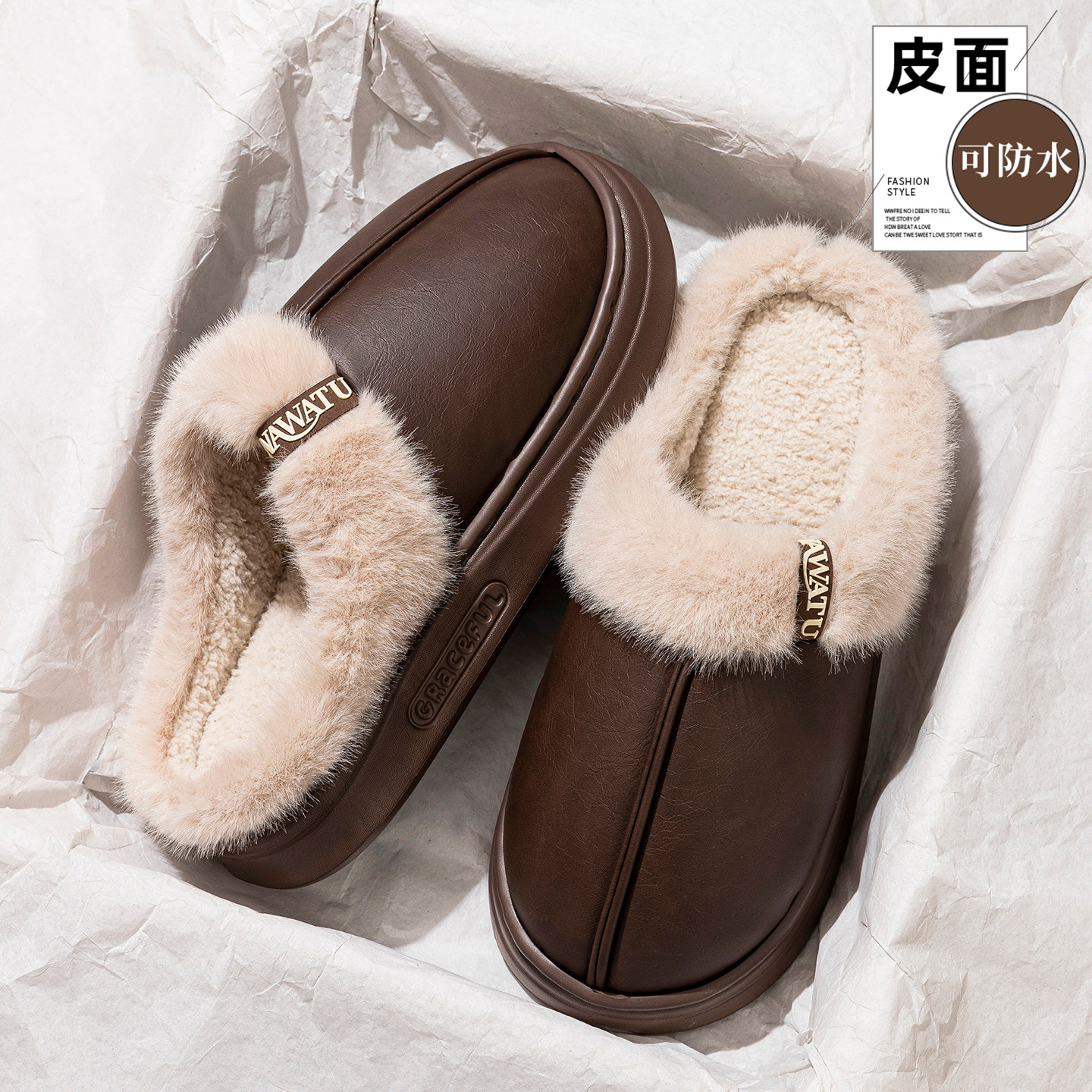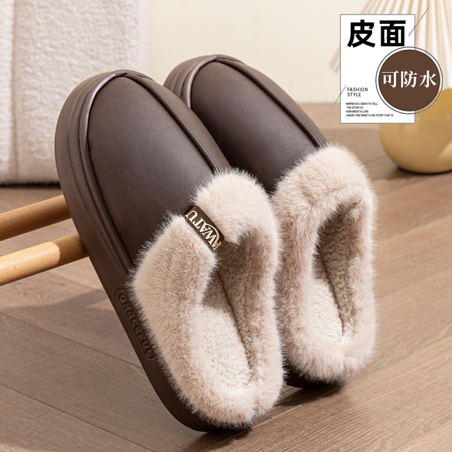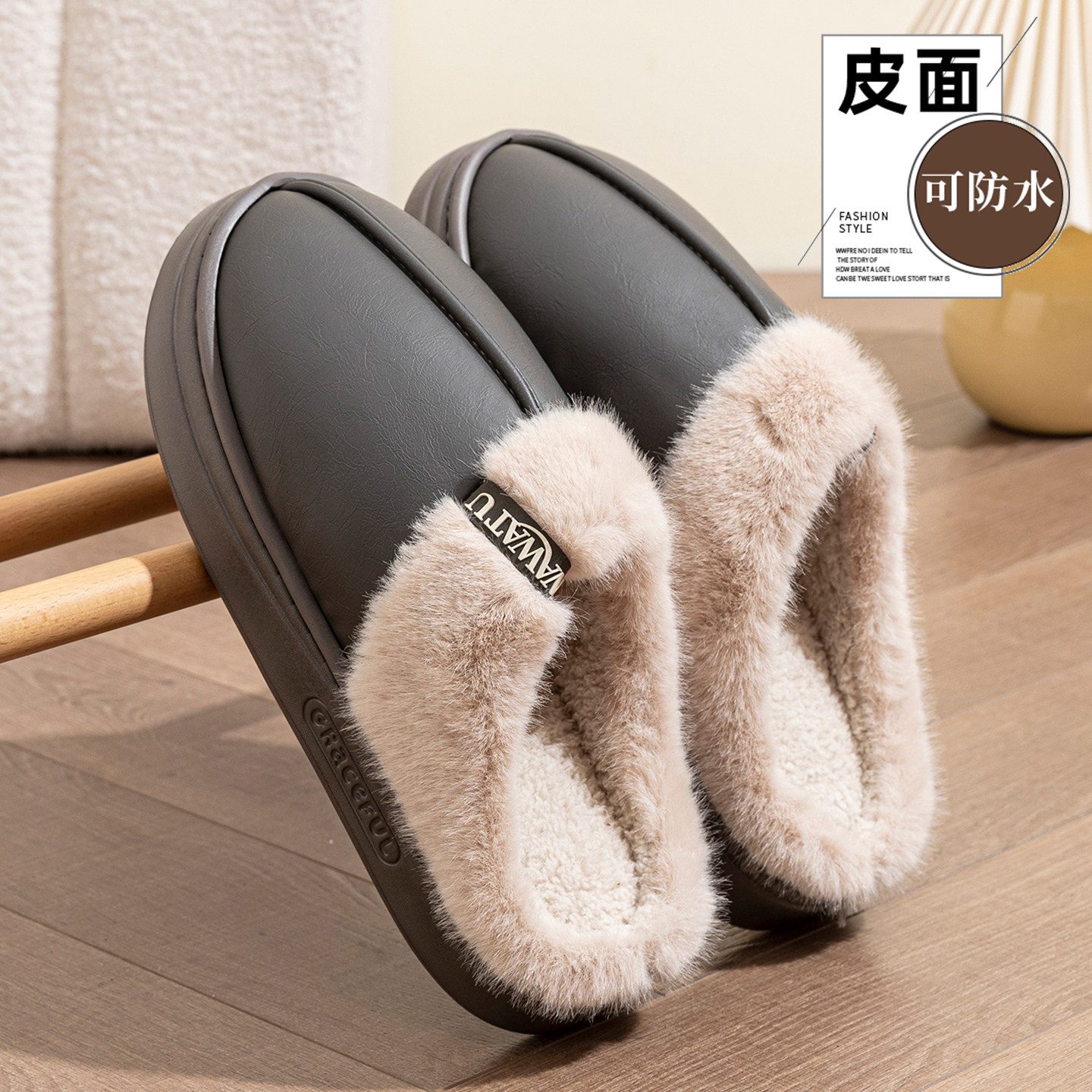 pu皮面防水棉拖鞋男士2025新款外穿厚底防滑家居室内保暖绒毛毛拖 - 沐雷娜旗舰店