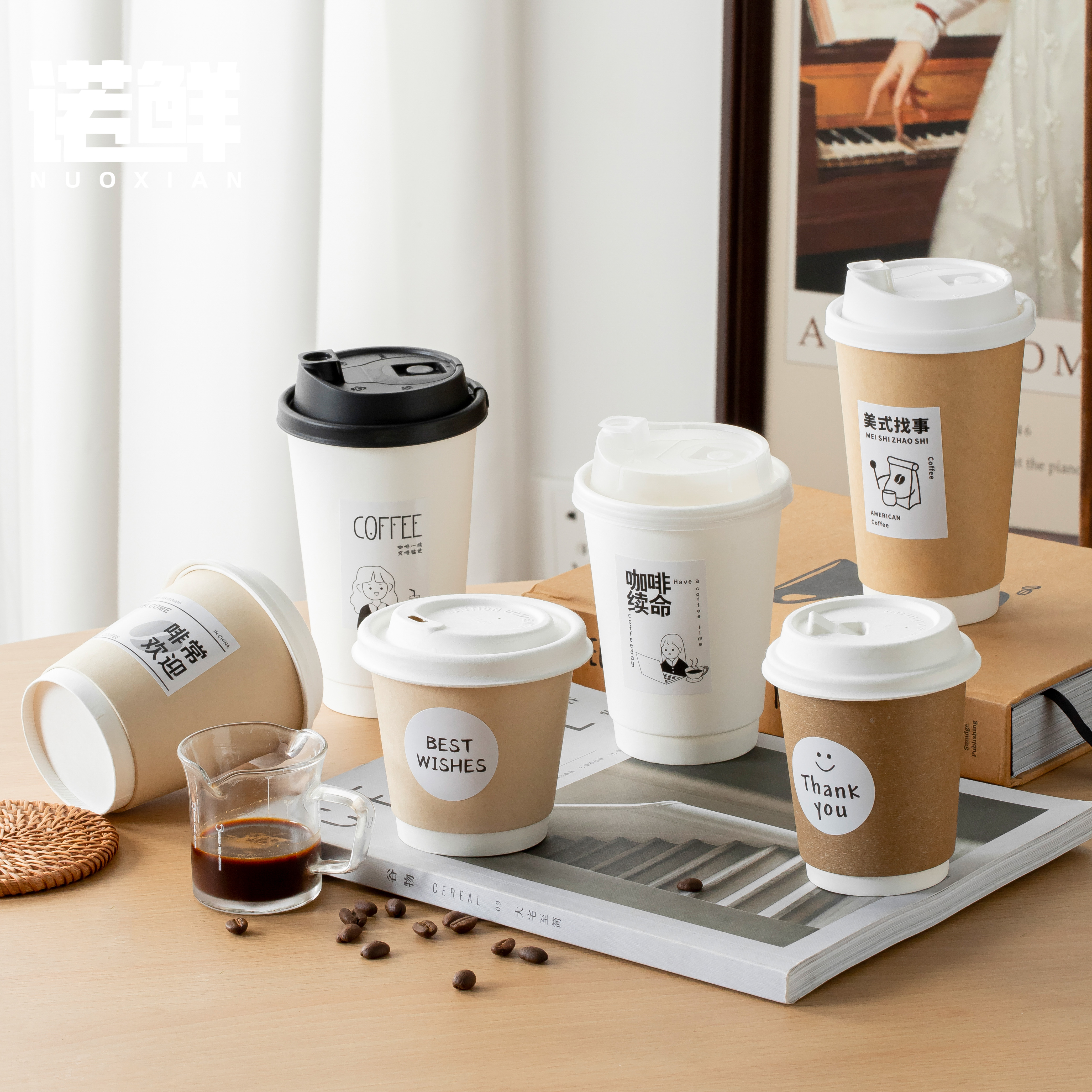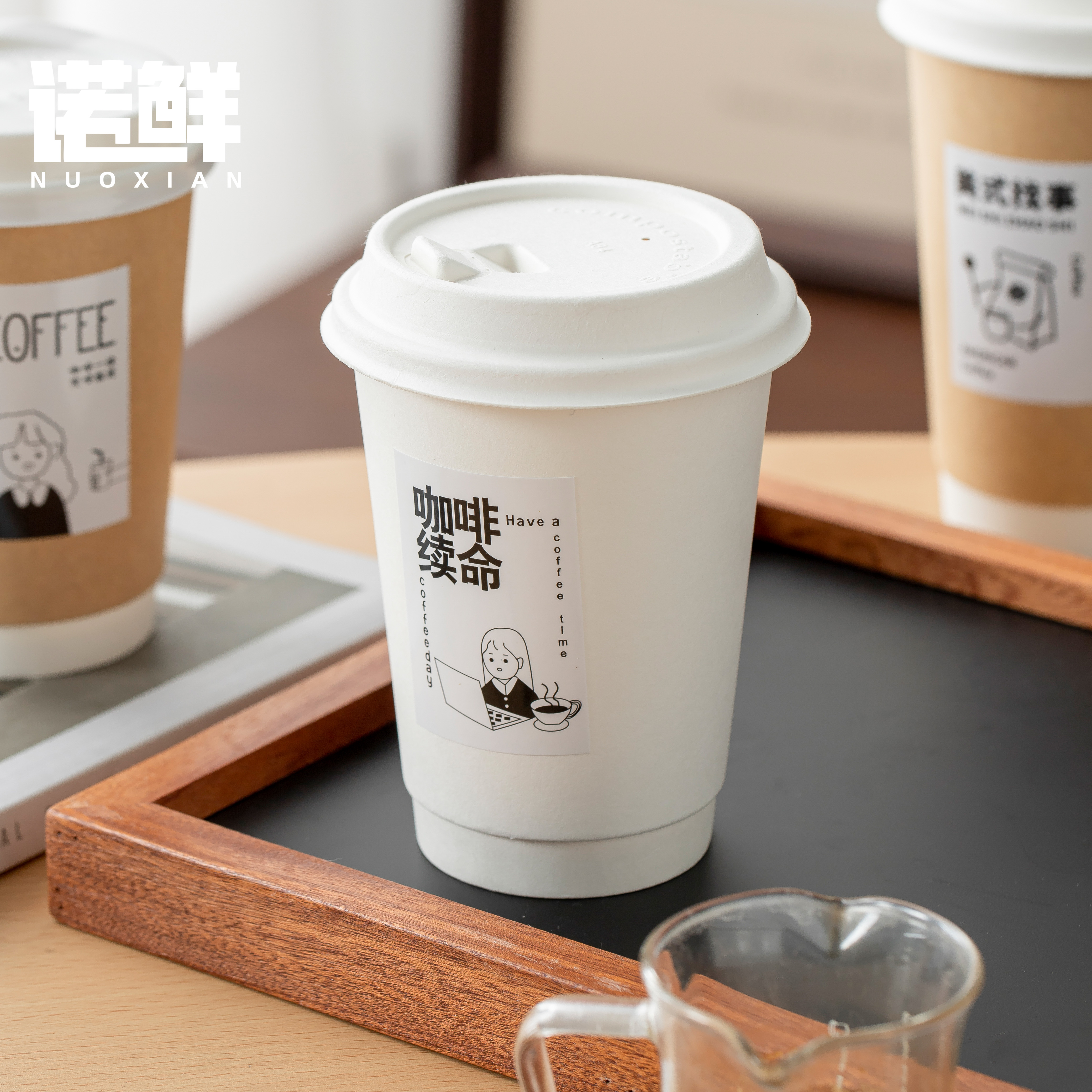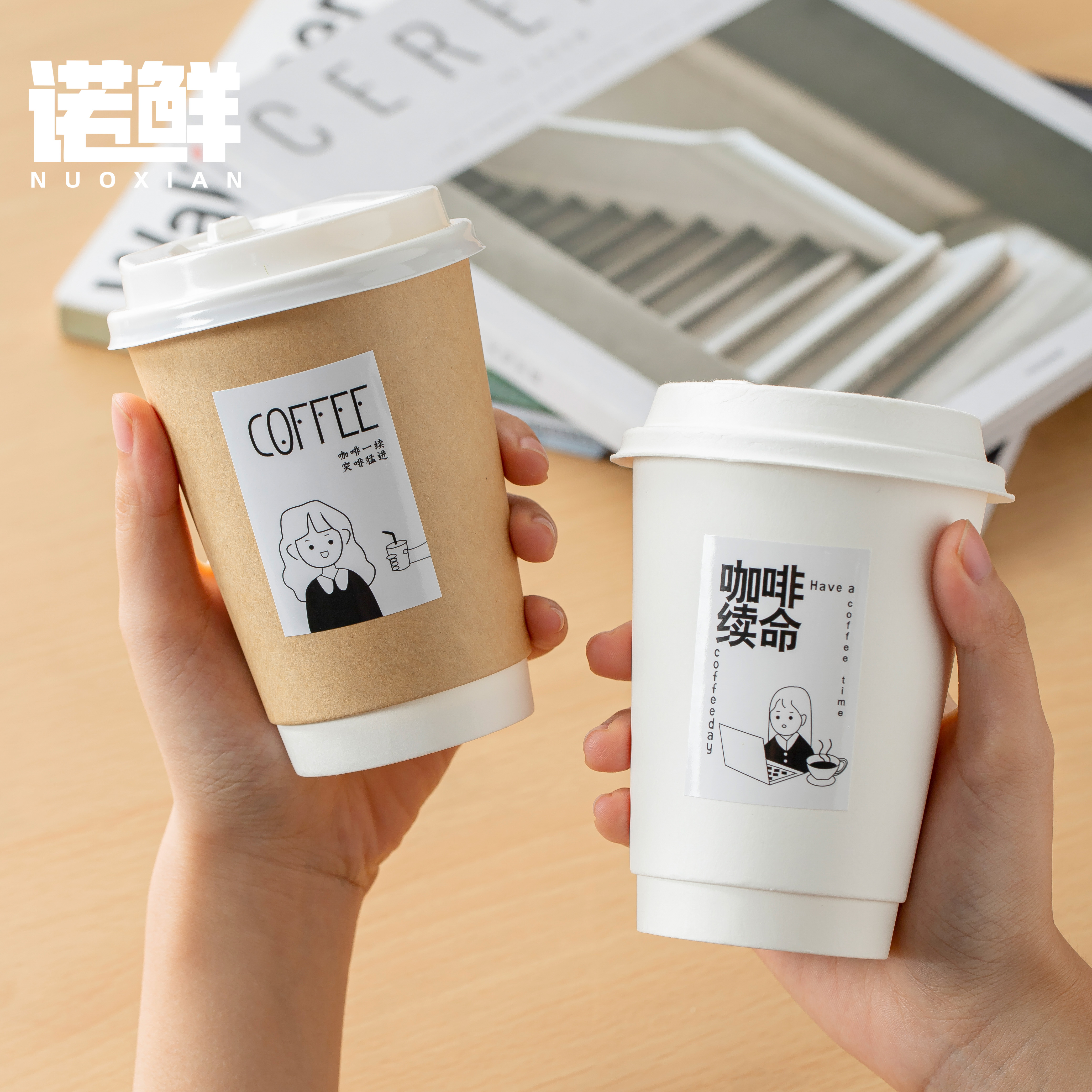 一次性咖啡杯带盖牛皮纸杯子加厚热饮奶茶打包杯外带家用商用定制 - 诺鲜餐饮品牌店