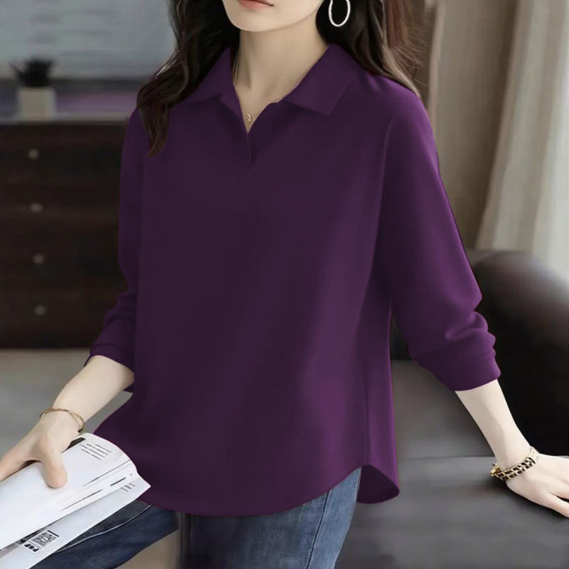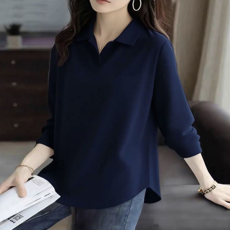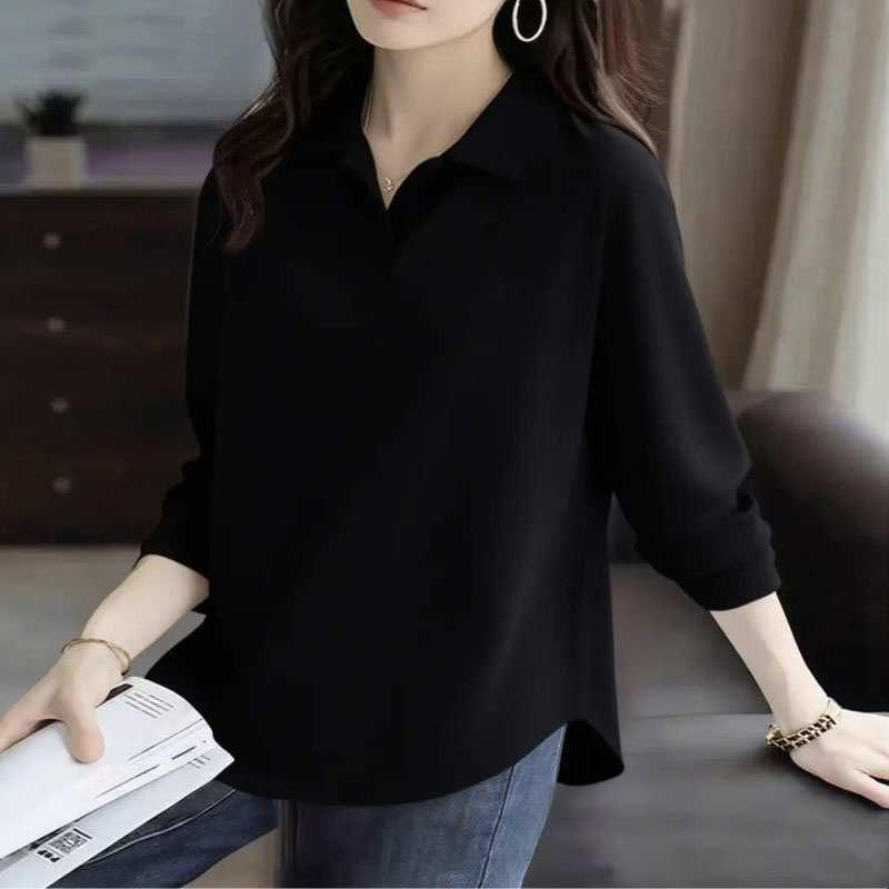 2025春秋冬百搭设计感新款纯棉翻领纯色长袖上衣不规则女士POLO衫 - 夏小华女装