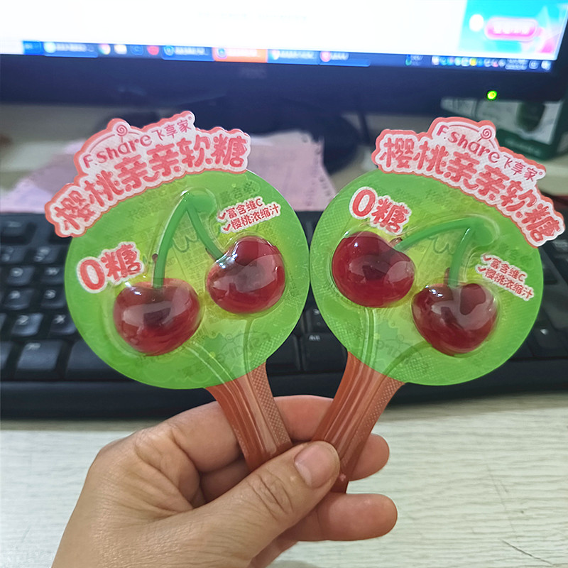 飞享家0蔗糖大草莓樱桃亲亲软糖棒棒糖无蔗糖水果零食风车糖240克
