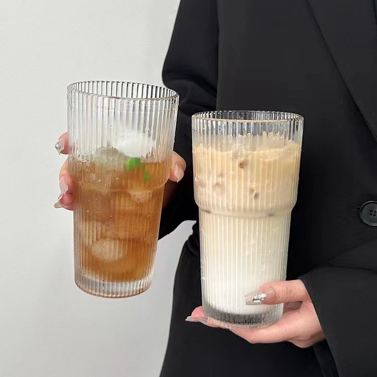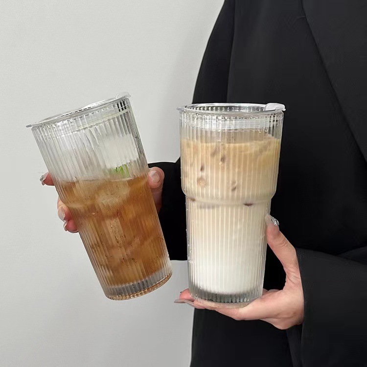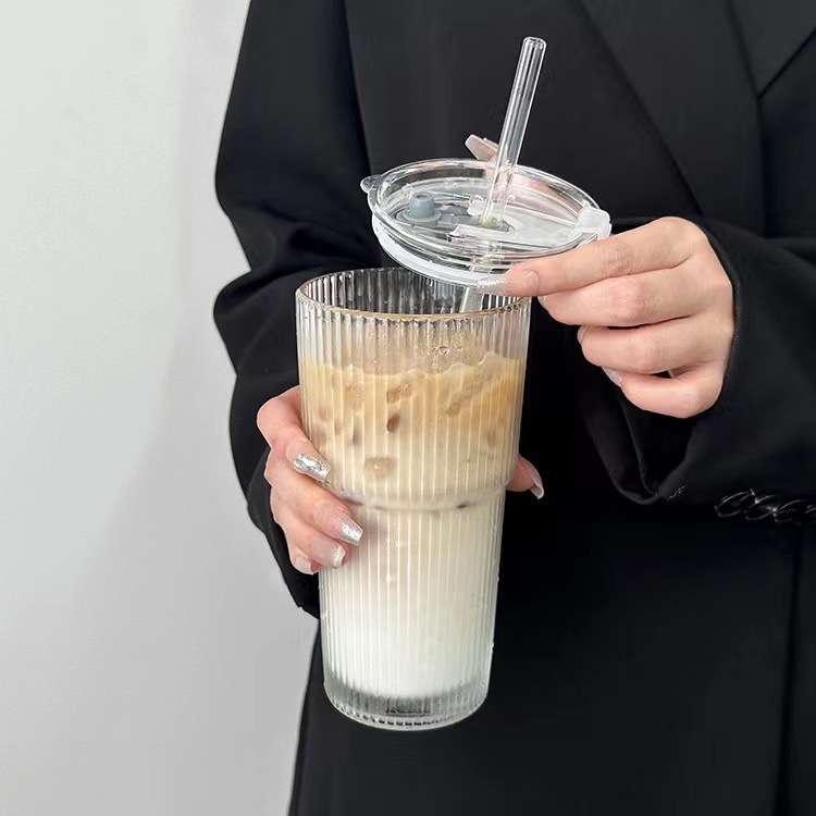 竖纹透明玻璃带盖吸管杯办公室大容量水杯女果汁杯咖啡杯茶杯 - 68qin8