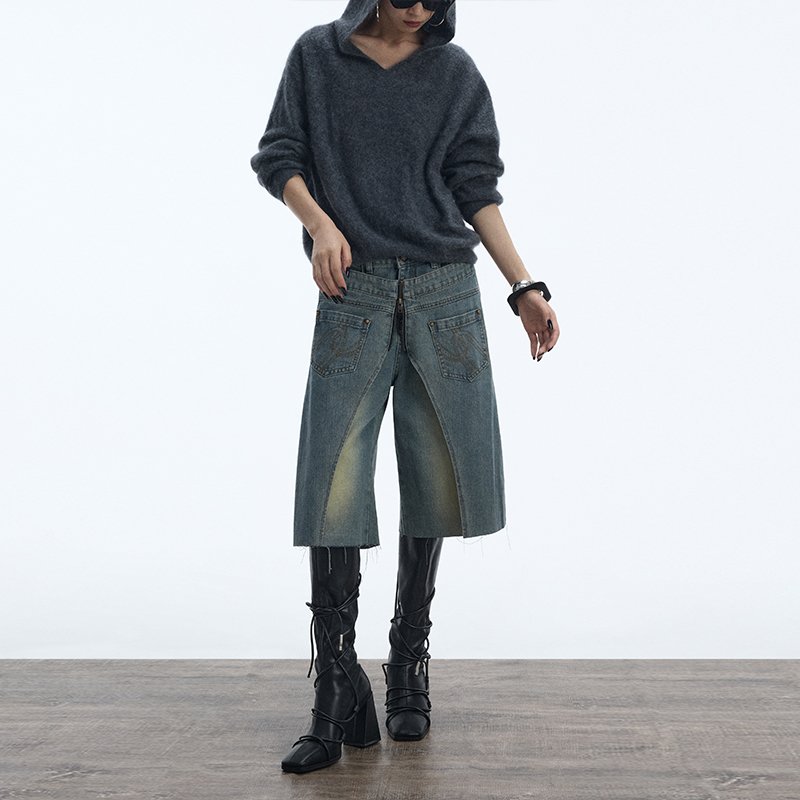 ourhour 复古做旧蓝 两片式门襟拉链五分牛仔中裤 女秋设计感短裤