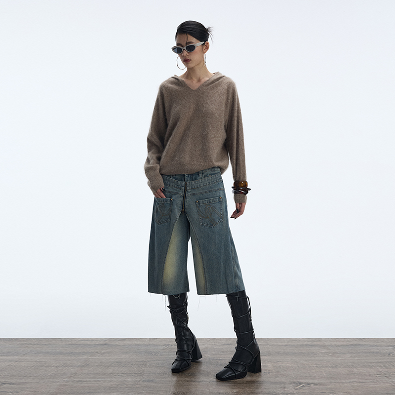 您的位置:他他商城  >   >  ourhour 复古做旧蓝 两片式门襟拉链五分牛仔中裤 女秋设计感短裤