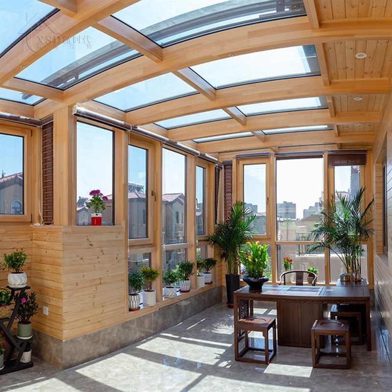 别墅露台阳光房钢结o构铝合金中空钢化玻璃铝包木断桥铝阳台安装