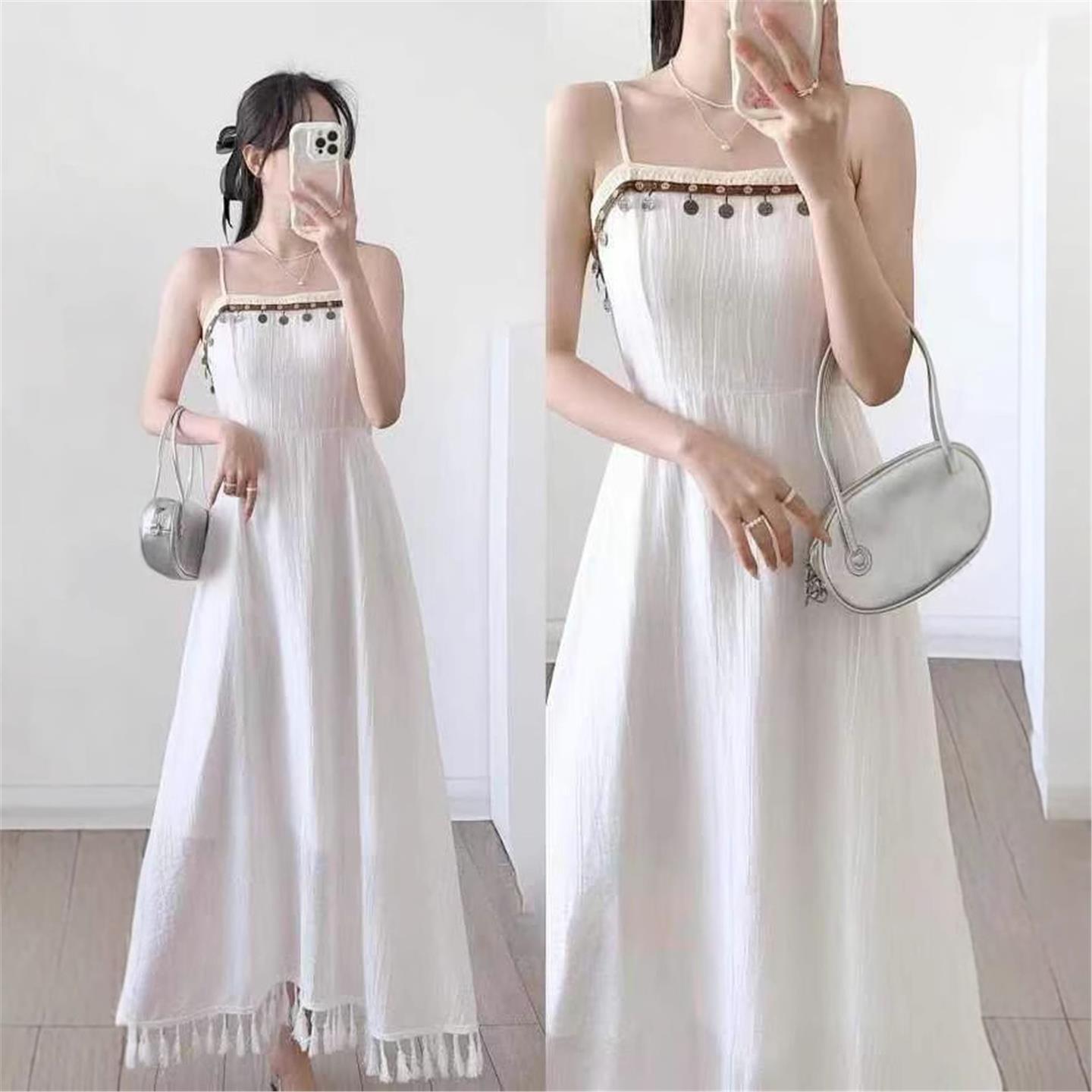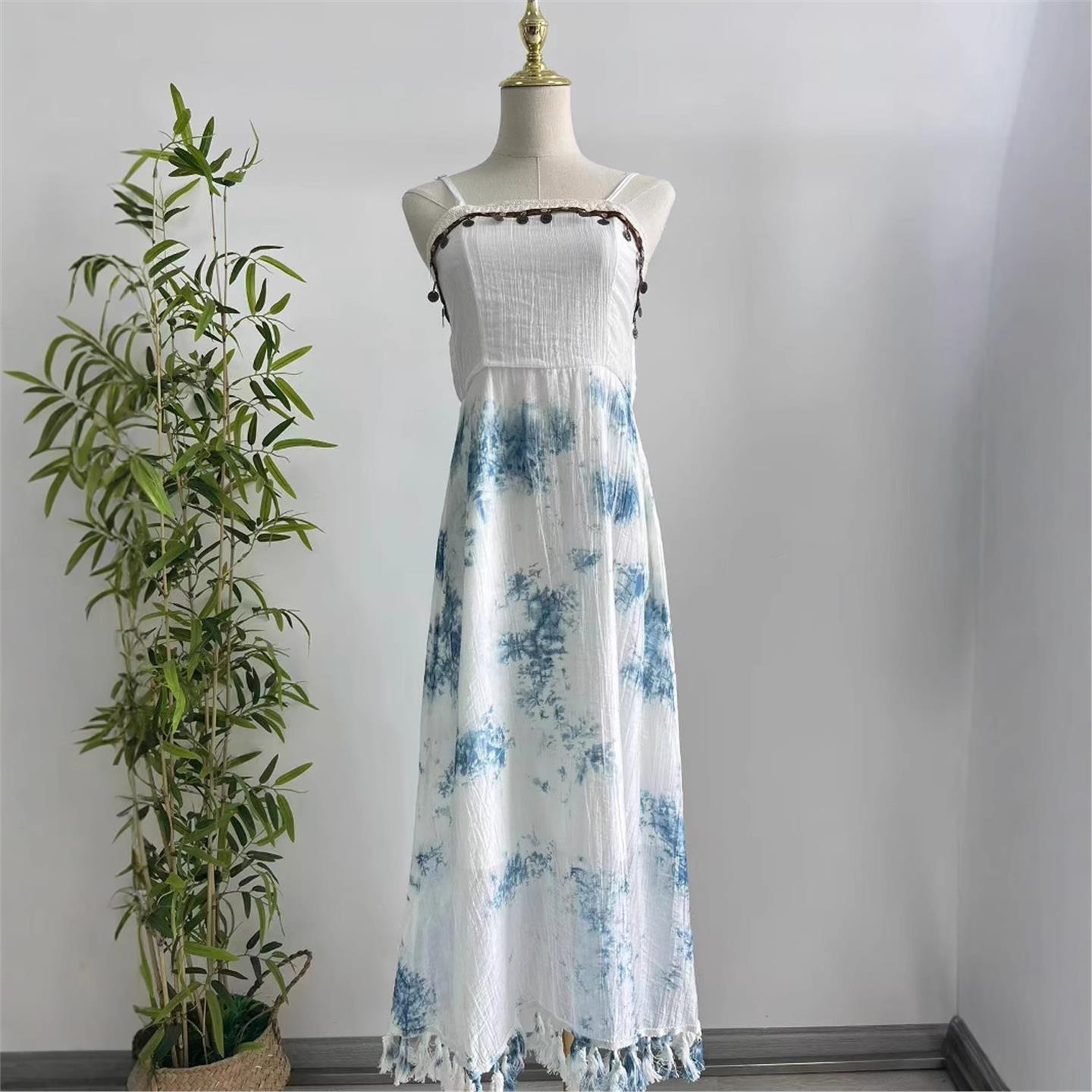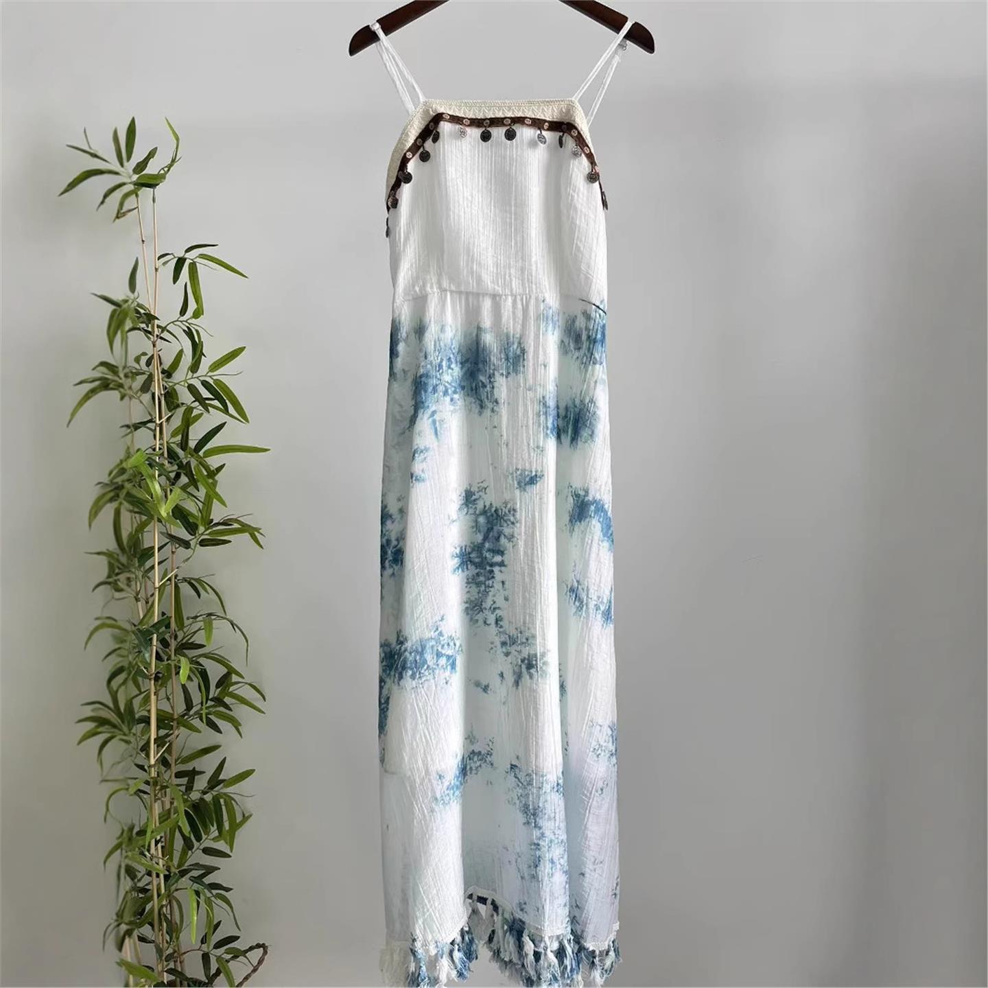 云南大理扎染吊带裙现货蓝染连衣裙旅游度假扎染连衣裙白裙子 - 柠檬绿茶城市店