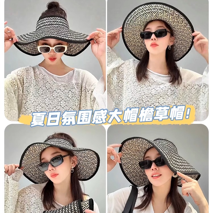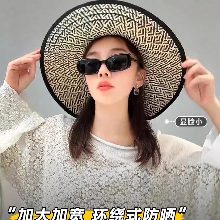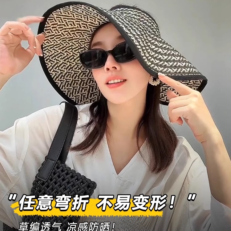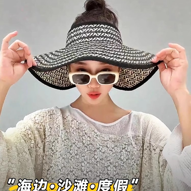 大帽檐草编空顶帽子女夏出游海边遮阳凉帽可折叠大头围防晒太阳帽 - 常米多帽子潮流