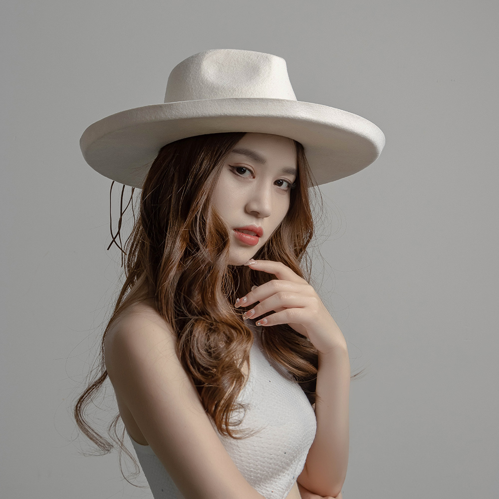 欧美新款时尚休闲系绳皇冠顶翘边羊毛呢礼帽凹造型逛街保暖大帽檐 - 百年帽饰
