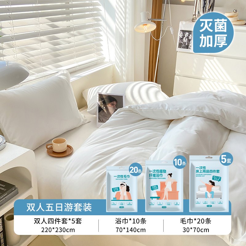 您的位置:他他商城  >  文体  >  酒店一次性床单被罩枕被四件灭菌隔脏人旅行床上用品夏季