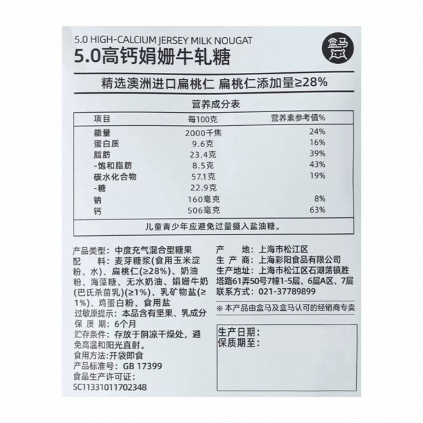 盒马 5.0高钙娟珊牛轧糖168g