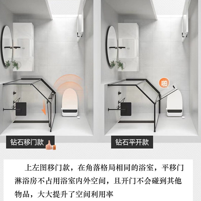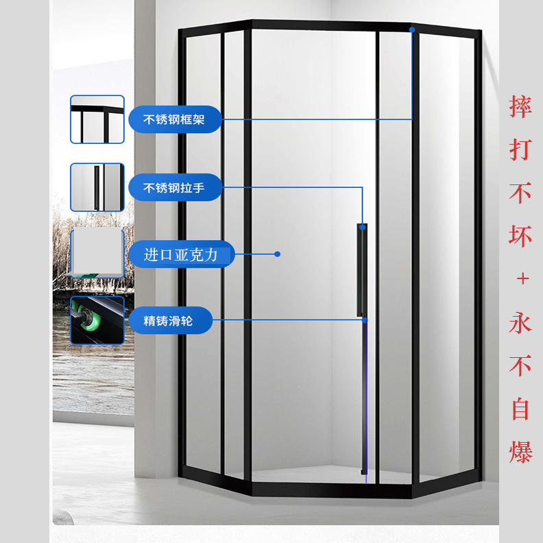 爱然摔打不坏永不自爆重量轻亚克力移门质保十年钻石形淋浴房