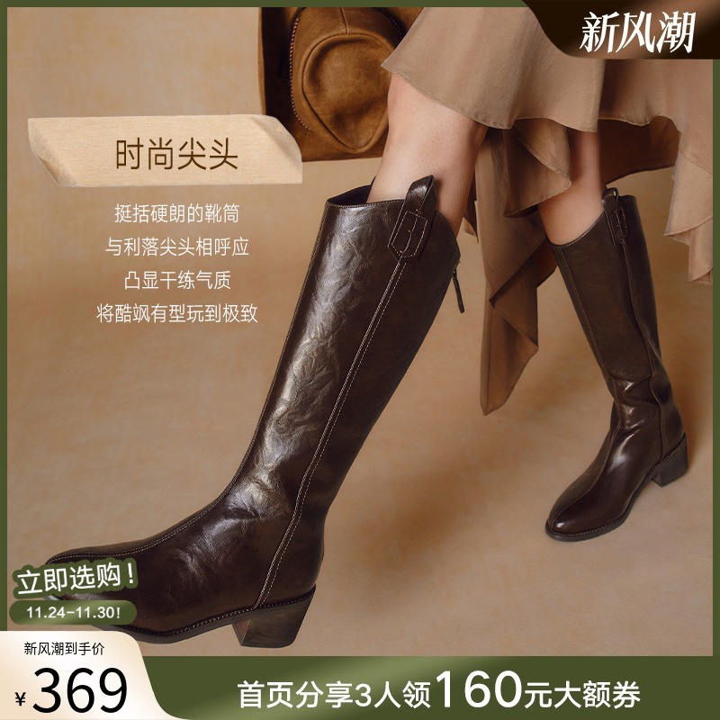 【关晓彤同款】百思图流浪者冬商场新款加绒大筒围V口骑士长靴女 - 百思图官方旗舰店
