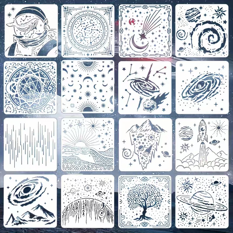 16张宇宙星空图案镂空绘画模板喷漆辅助模具用于木材墙壁装饰设计
