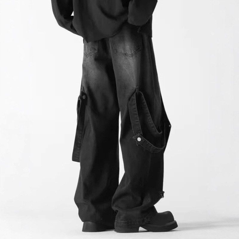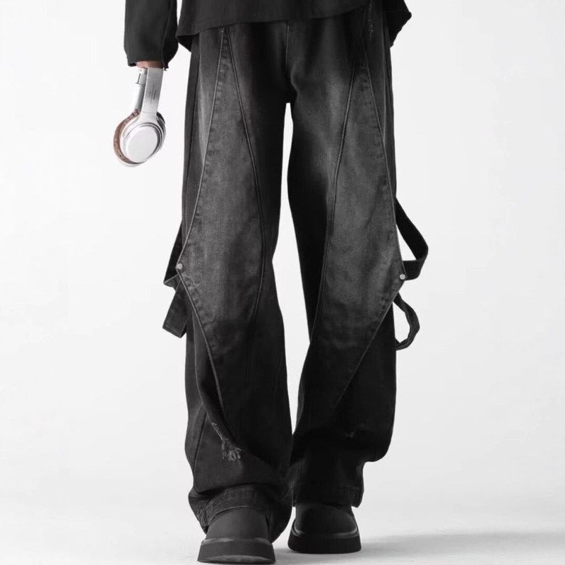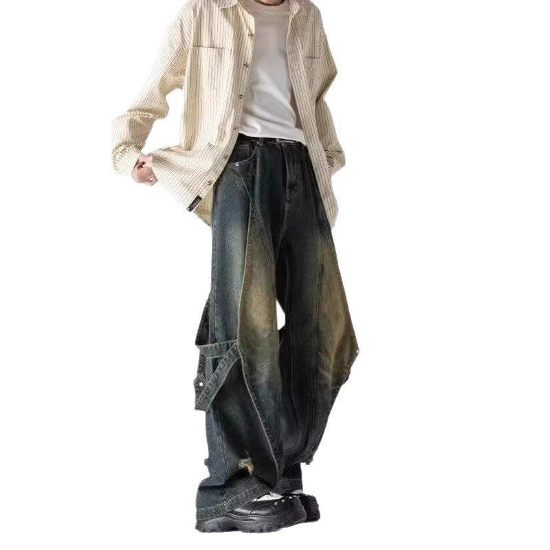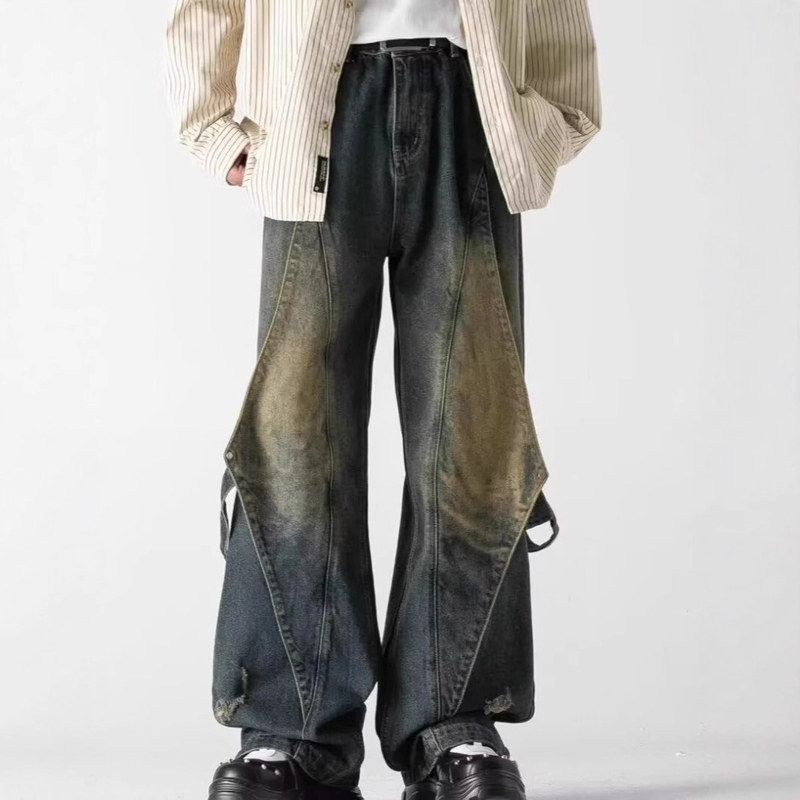 GWCJ港坞尘界|直筒做旧阔腿牛仔裤男拼接设计复古长裤休闲百搭 - GWCJ港坞尘界服饰