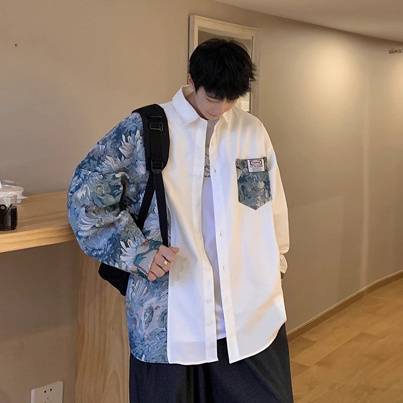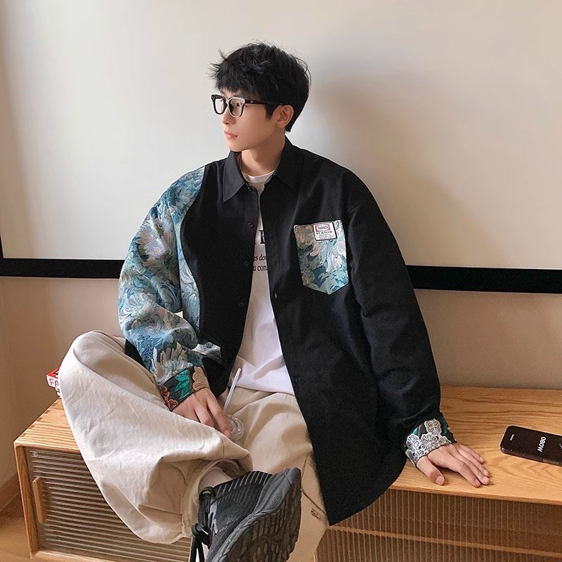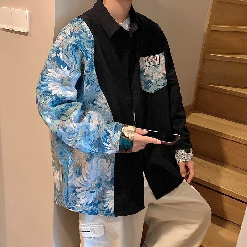 特大码300斤国潮撞色花衬衫男春季美式高街设计感民族风拼接衬衣2 - 泰发轩商城