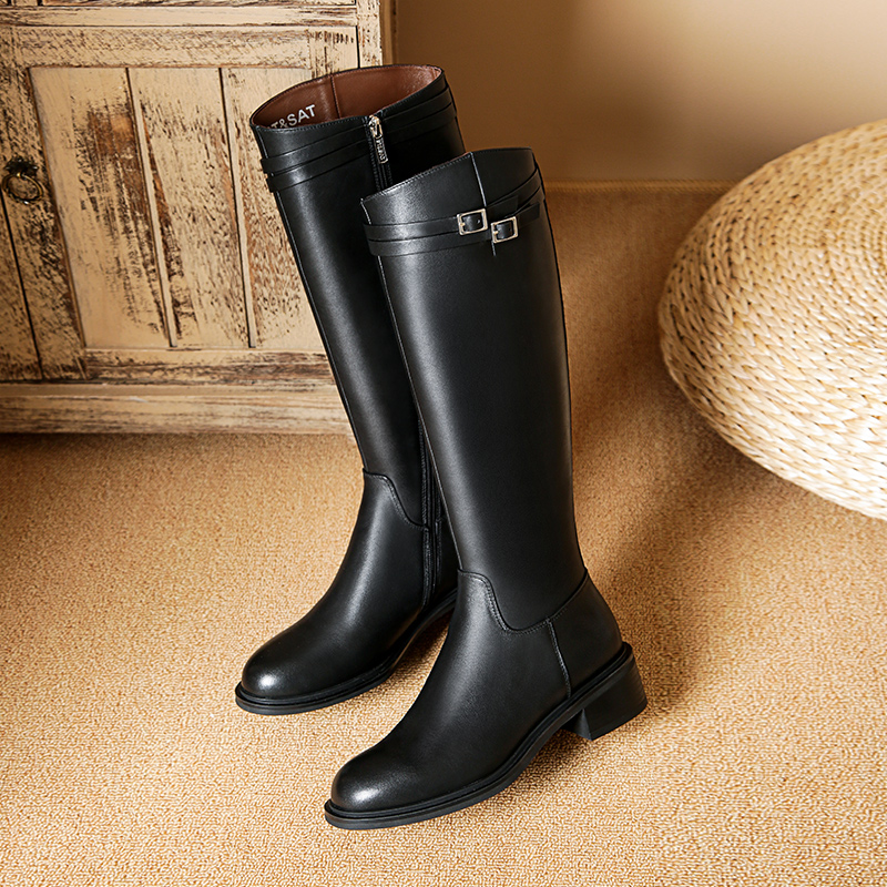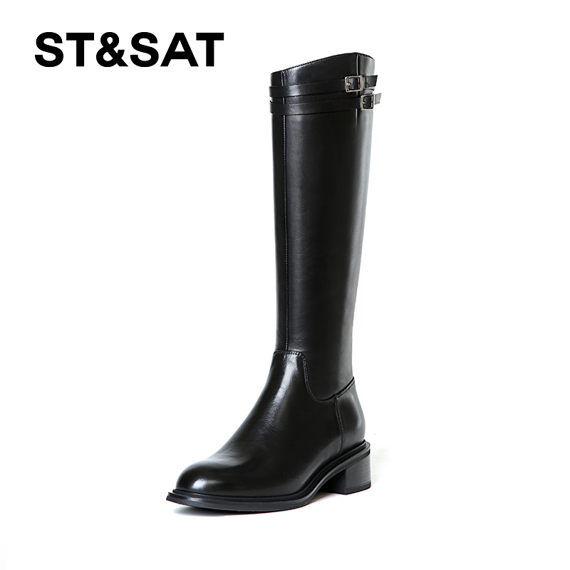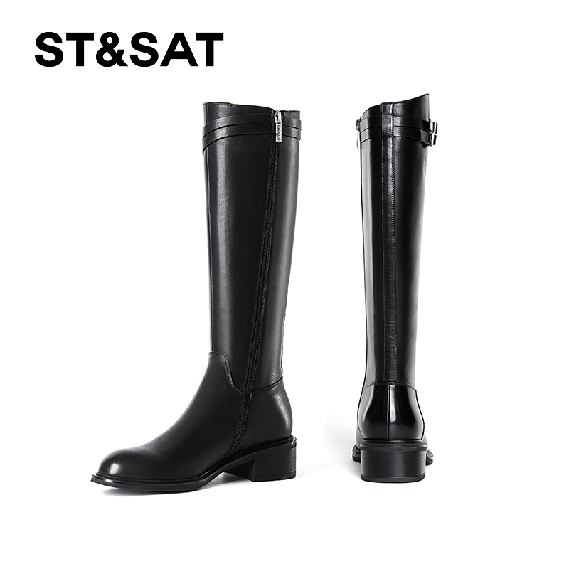 星期六英伦风长筒靴女2025秋冬粗跟圆头显瘦高不过膝全牛皮长靴子 - 星期六官方旗舰店