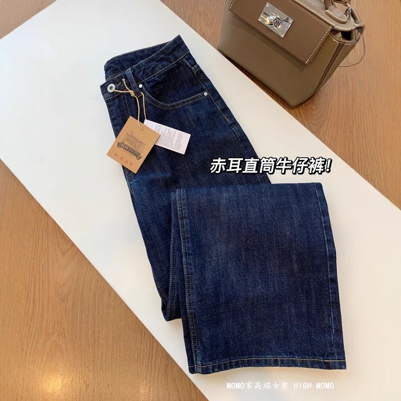 超显腿直 丹宁原色深蓝色全棉红翻边高腰显瘦赤耳直筒牛仔裤女秋