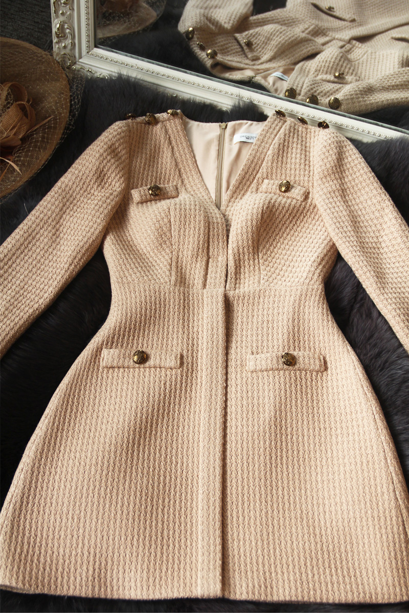 您的位置:他他商城  >   >  浅卡其杏色深V领修身显瘦气质优雅白领ol职场超短简章设计连衣裙