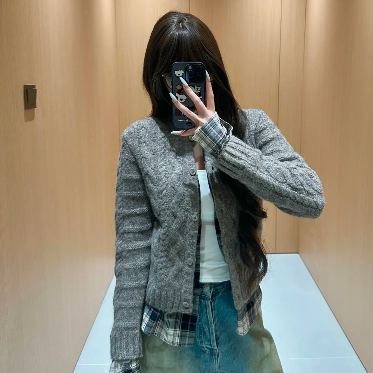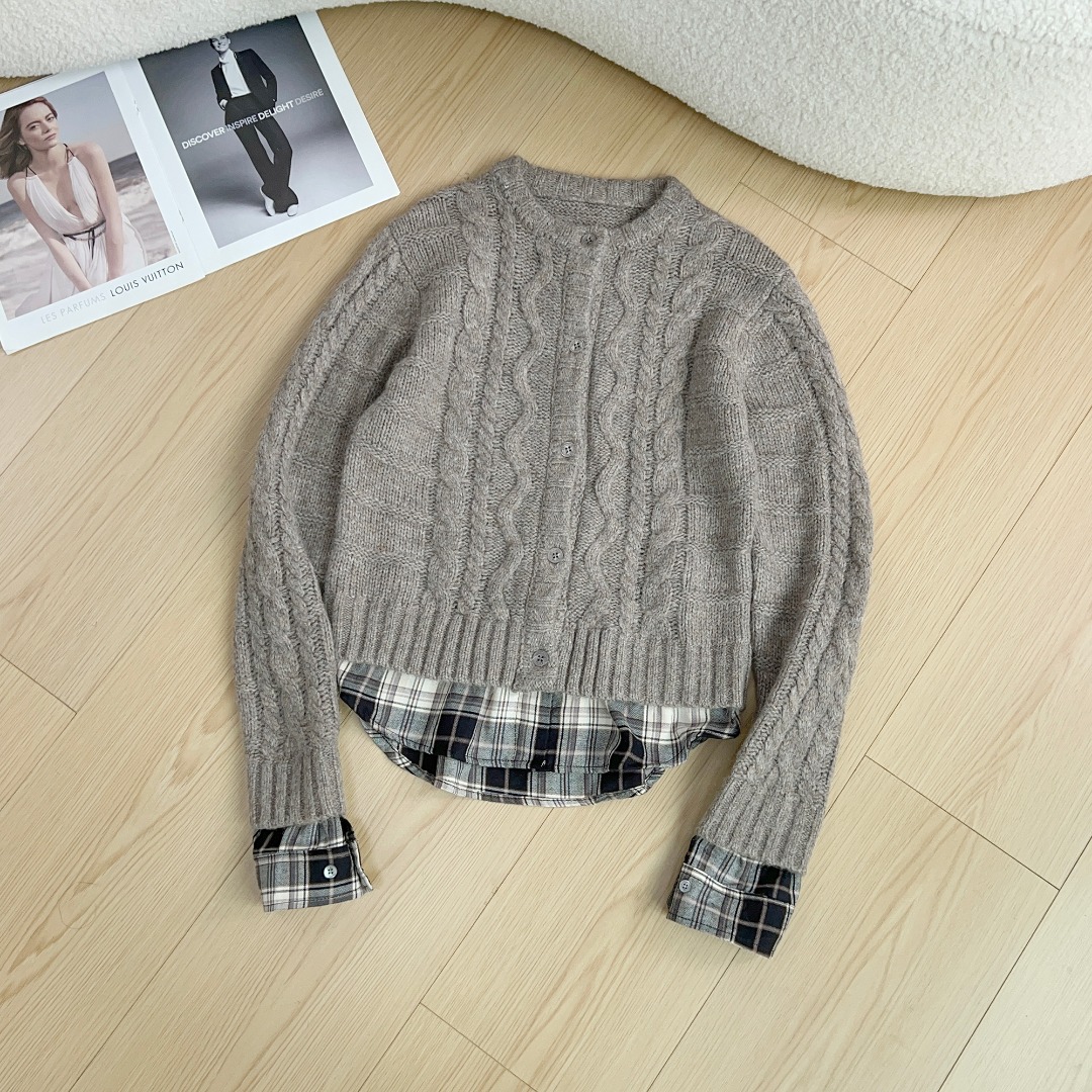 现货25秋冬款设计师品牌针织衫拼接格子衬衫假两件设计感开衫外套