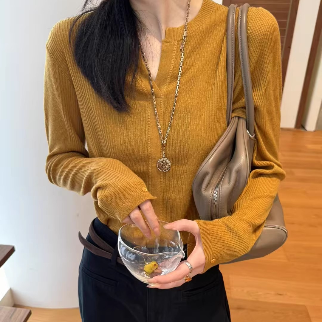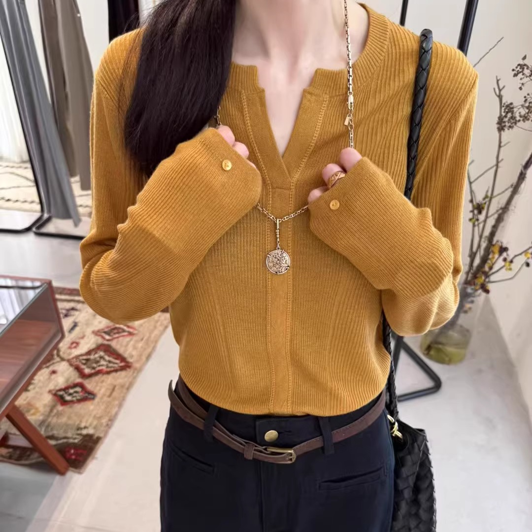 您的位置:他他商城  >   >  欧洲站2025秋冬百搭打底衫收腰压线剪刀领显瘦气质羊毛针织衫上衣