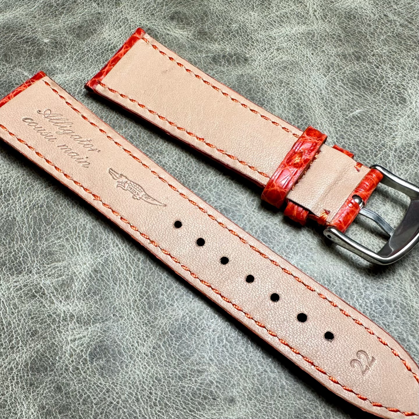 您的位置:他他商城  >   >  只有几条,特价品22mm毫米桔色美洲鳄鱼皮圆纹表带小牛皮底