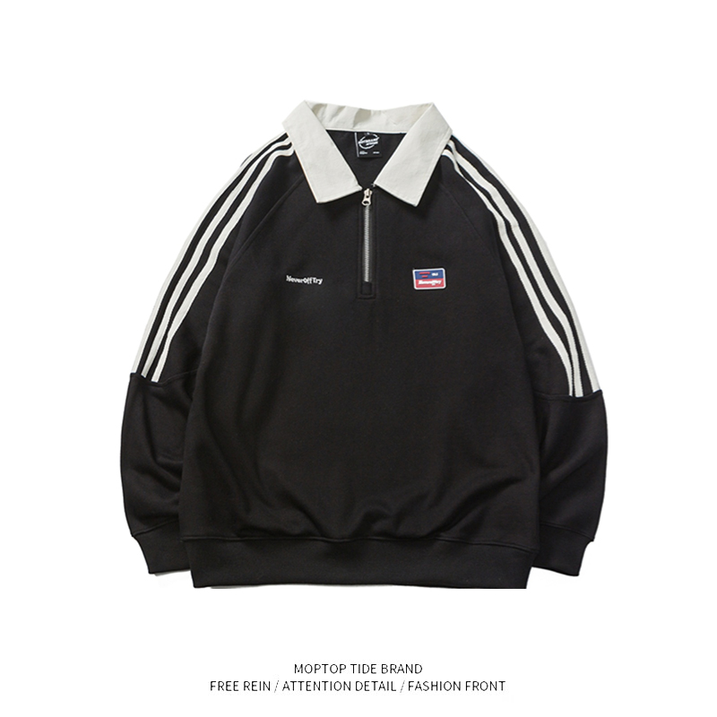 日系复古套头卫衣男春秋新款撞色翻领三条杠宽松卫衣半身拉链卫衣 - WH先生原创设计