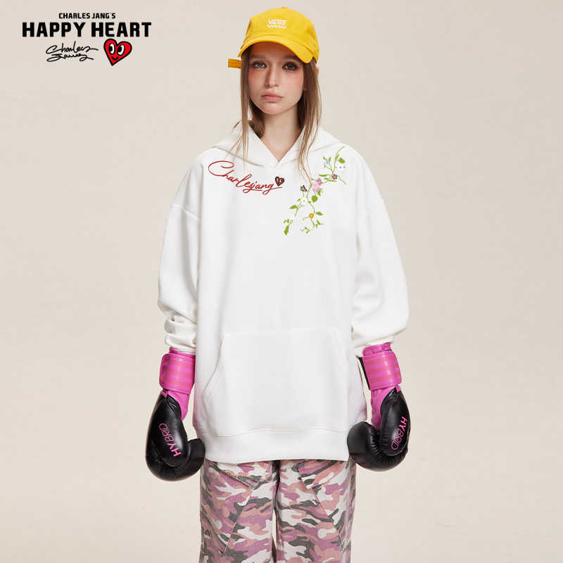查尔斯桃心 美式花卉印花加绒加厚卫衣男连帽秋冬季新款情侣外套