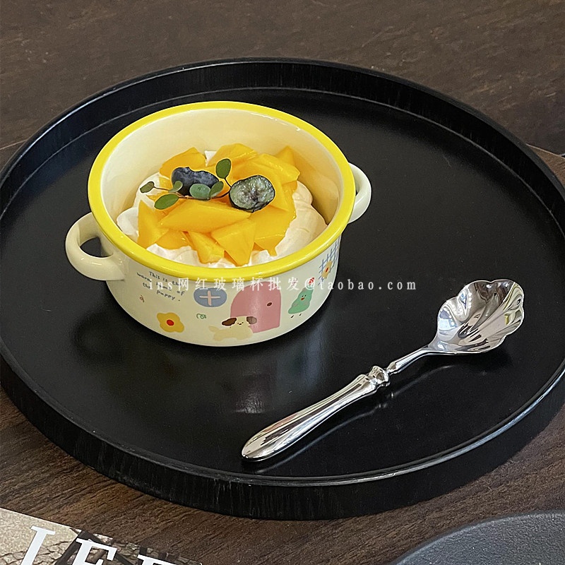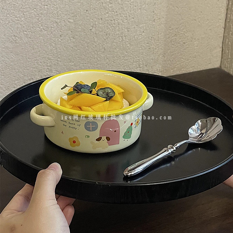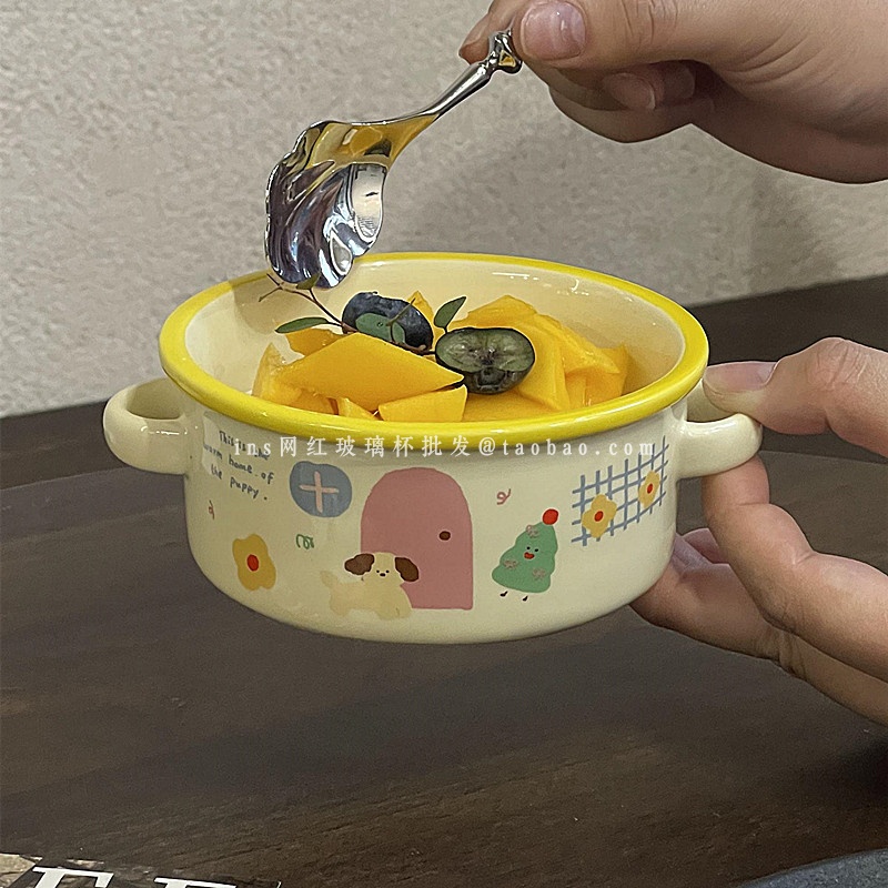 韩式奶油色陶瓷双耳碗ins风可爱小狗插画奶油蛋糕碗甜品碗酸奶碗 - ins网红玻璃杯批发