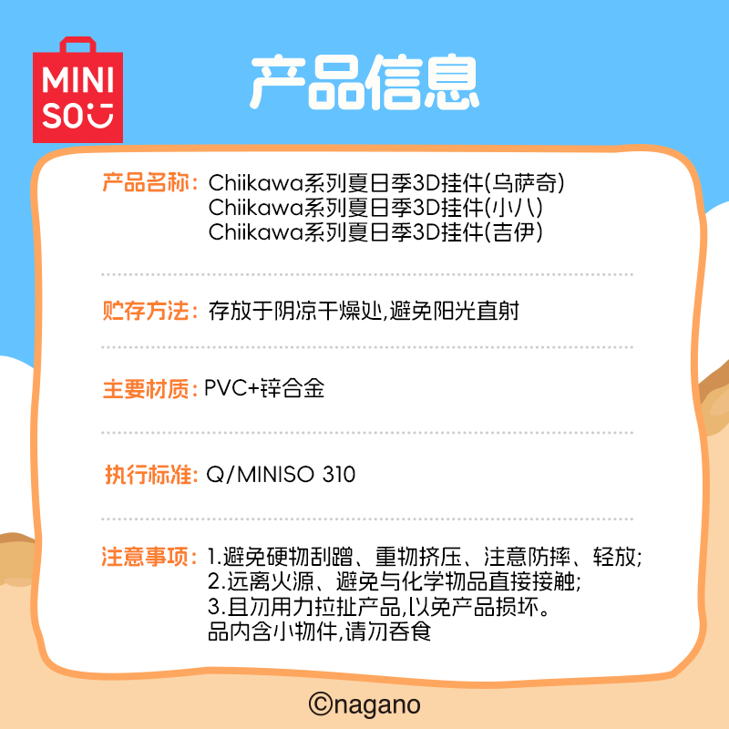 您的位置:他他商城  >  文体  >  MINISO名创优品Chiikawa系列夏日季3D挂件可爱钥匙扣卡通吉伊小八