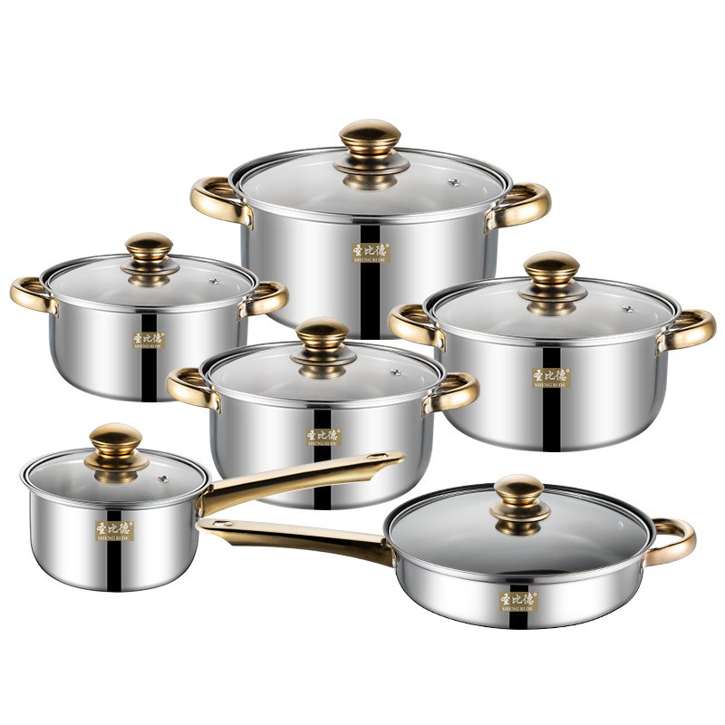 跨境电商不锈钢12件套锅具套装金色手柄水壶厨房烹饪锅具cookware
