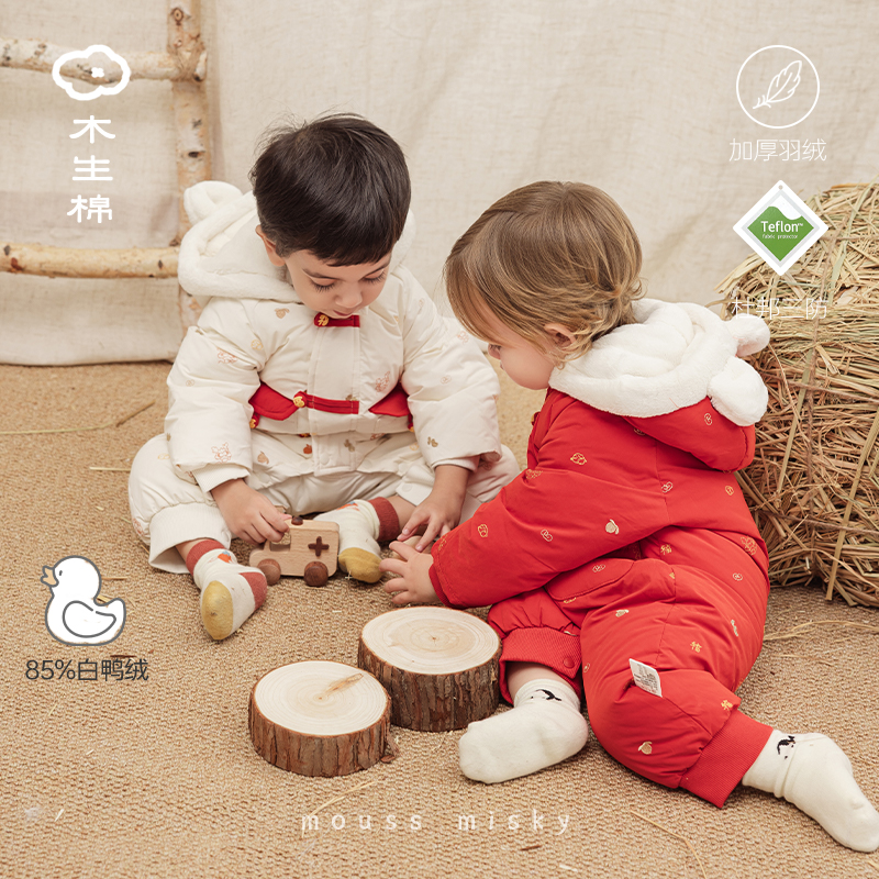 婴儿冬季羽绒保暖连体衣服宝宝三防白鸭绒红色新年拜年哈衣周岁礼 - 木生棉旗舰店