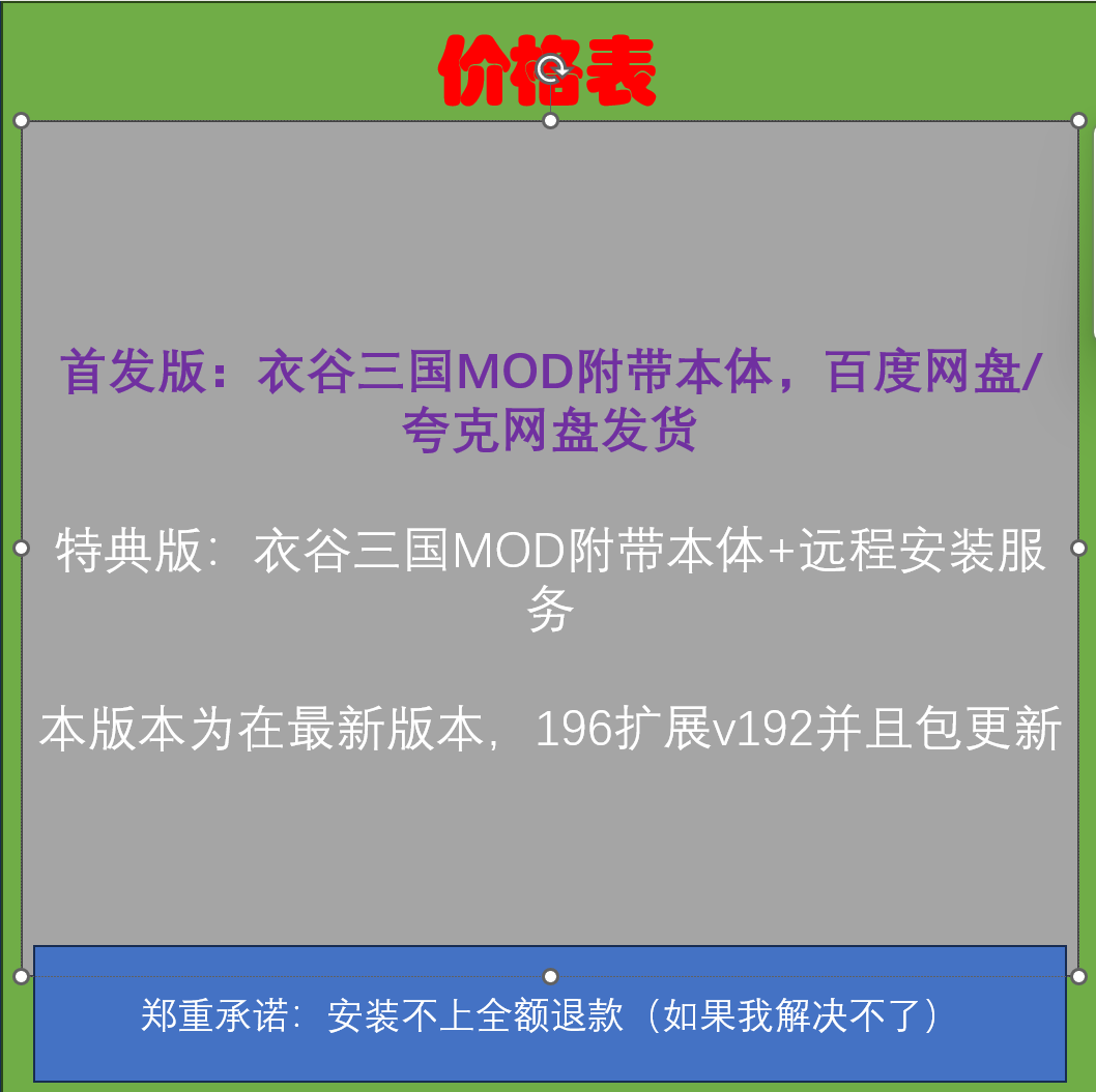 您的位置:他他商城  >   >  骑马与砍杀2MOD衣谷三国196扩展包,新版本,自动发货包更新