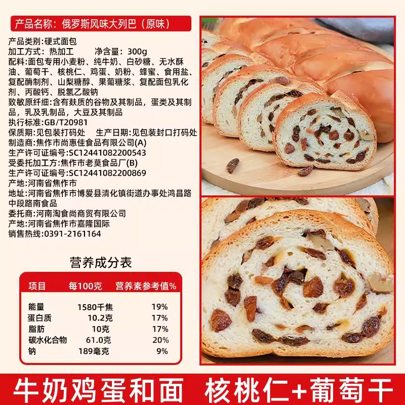 大列巴面包俄罗斯风味核桃仁葡萄干坚果好吃的方便早餐代餐零食