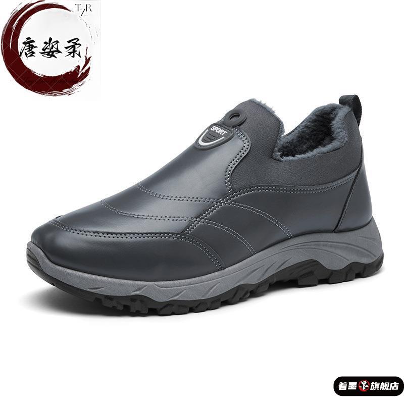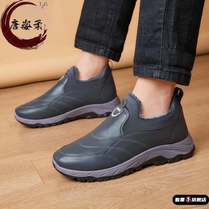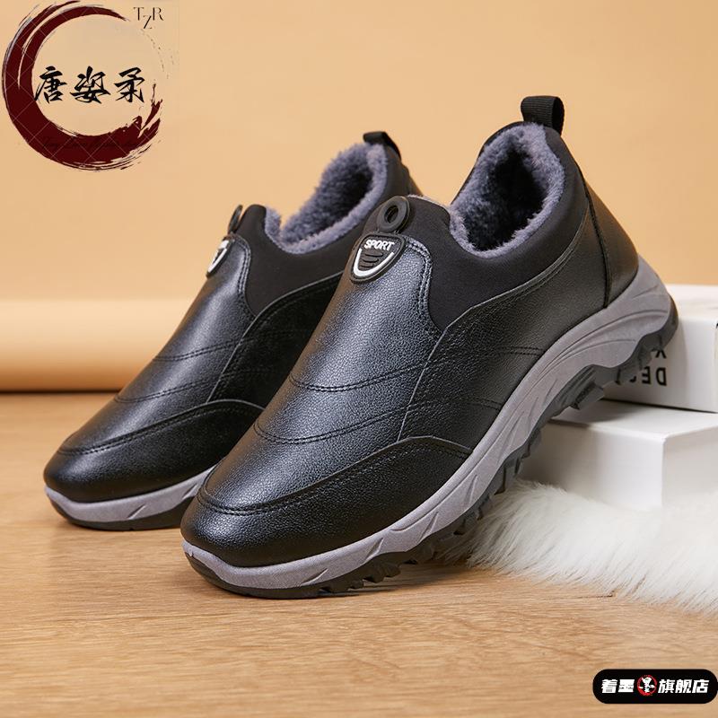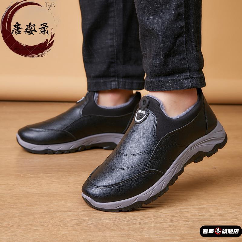 秋冬季男士棉靴加绒加厚皮面防水中老年一脚蹬中老年爸爸保暖棉鞋 - 着墨旗舰店