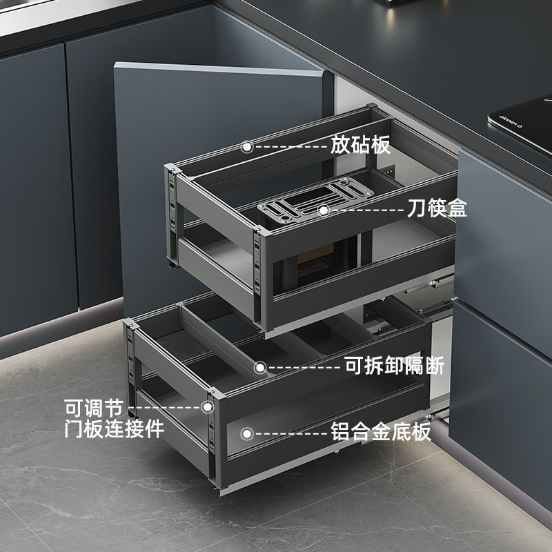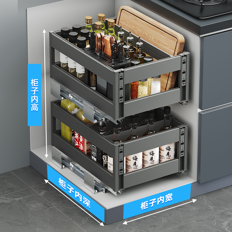 您的位置:他他商城  >  居家  >  厨房窄柜铝合金调味拉篮橱柜小规格双层防锈多功能调料篮开门抽屉