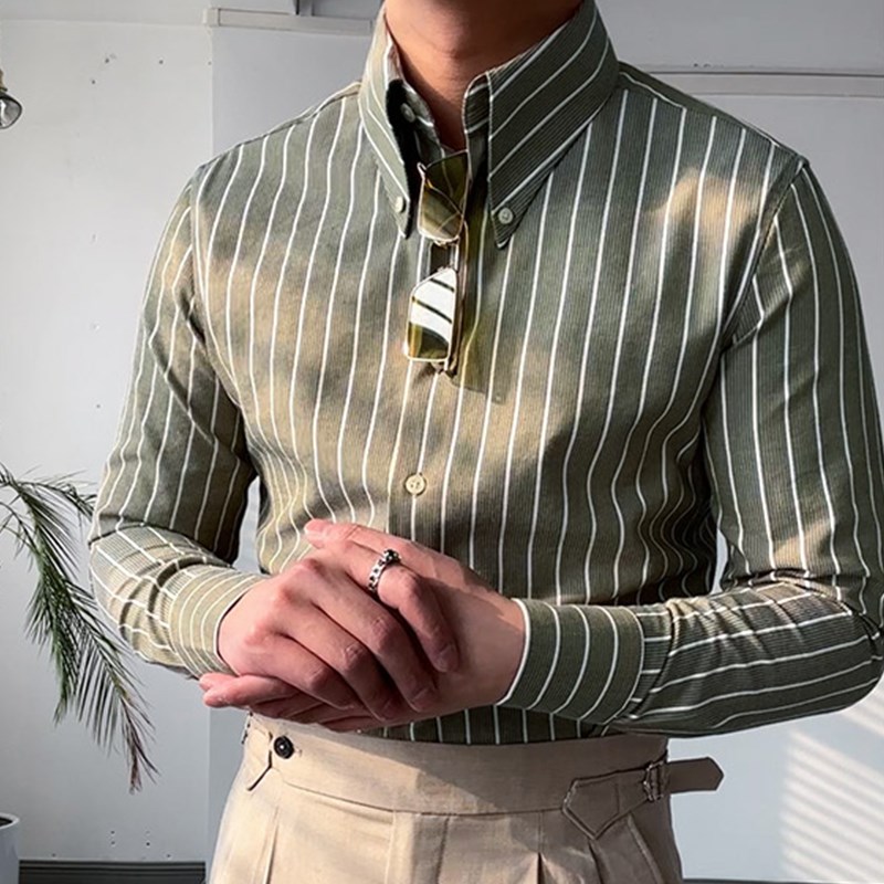 男士休闲商务长袖条纹衬衫意式复古绿纽扣长尖领衬衣时尚个性修身 - 德道汇严选店