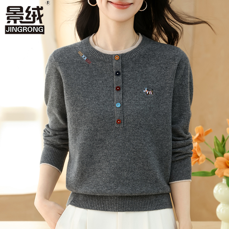 100%纯羊毛毛衣女秋冬季大码妈妈圆领针织上衣气质百搭打底羊绒衫 - 景绒工厂店