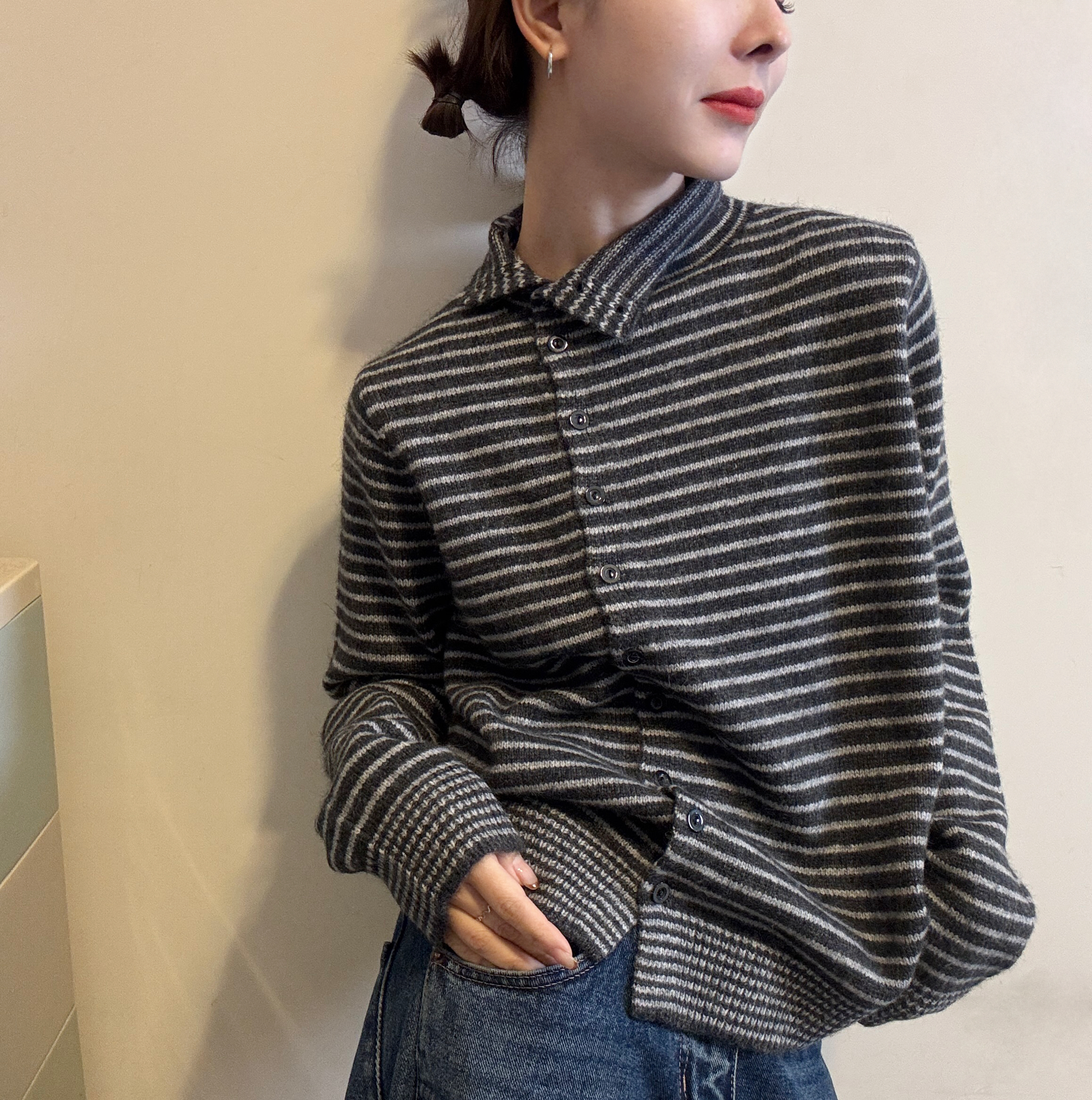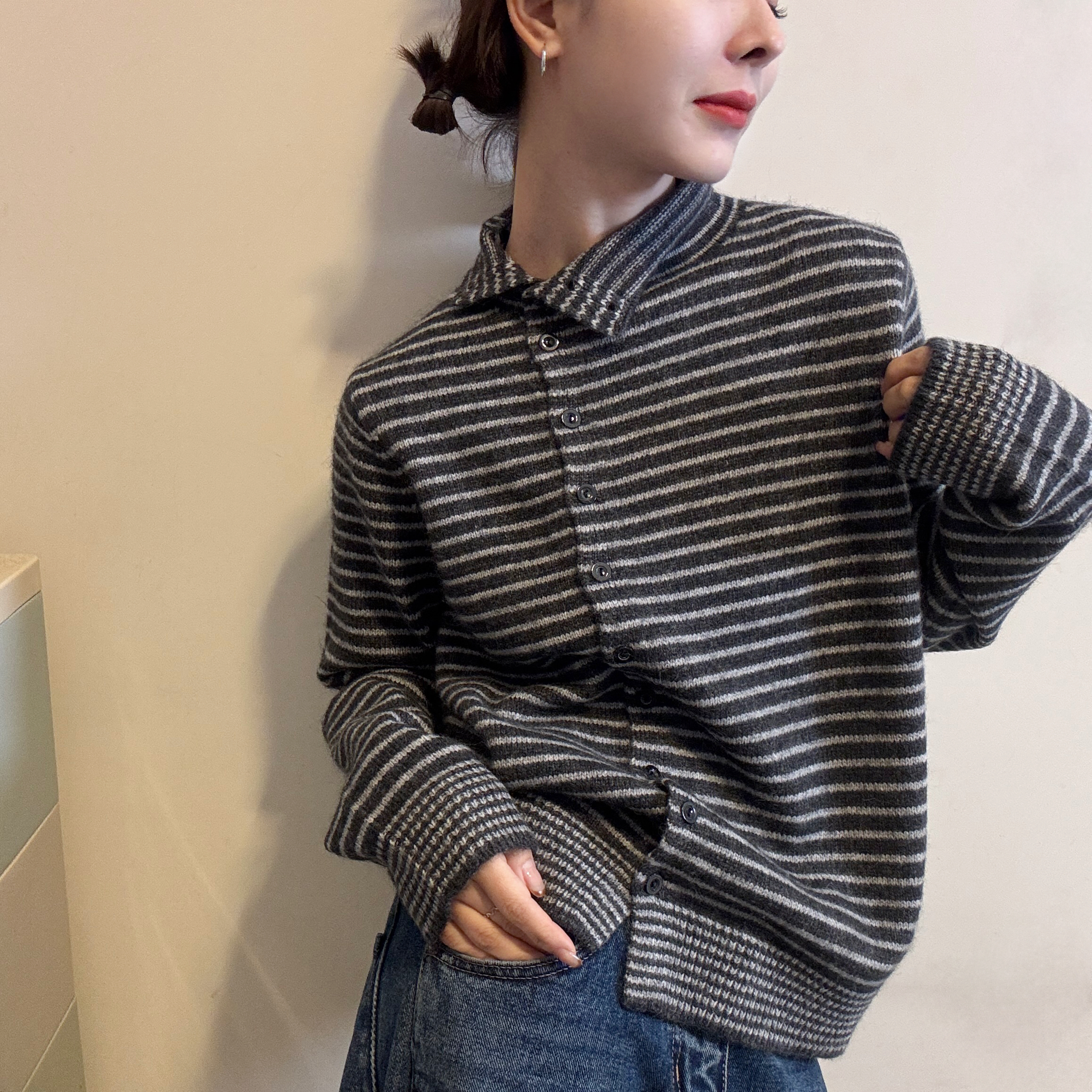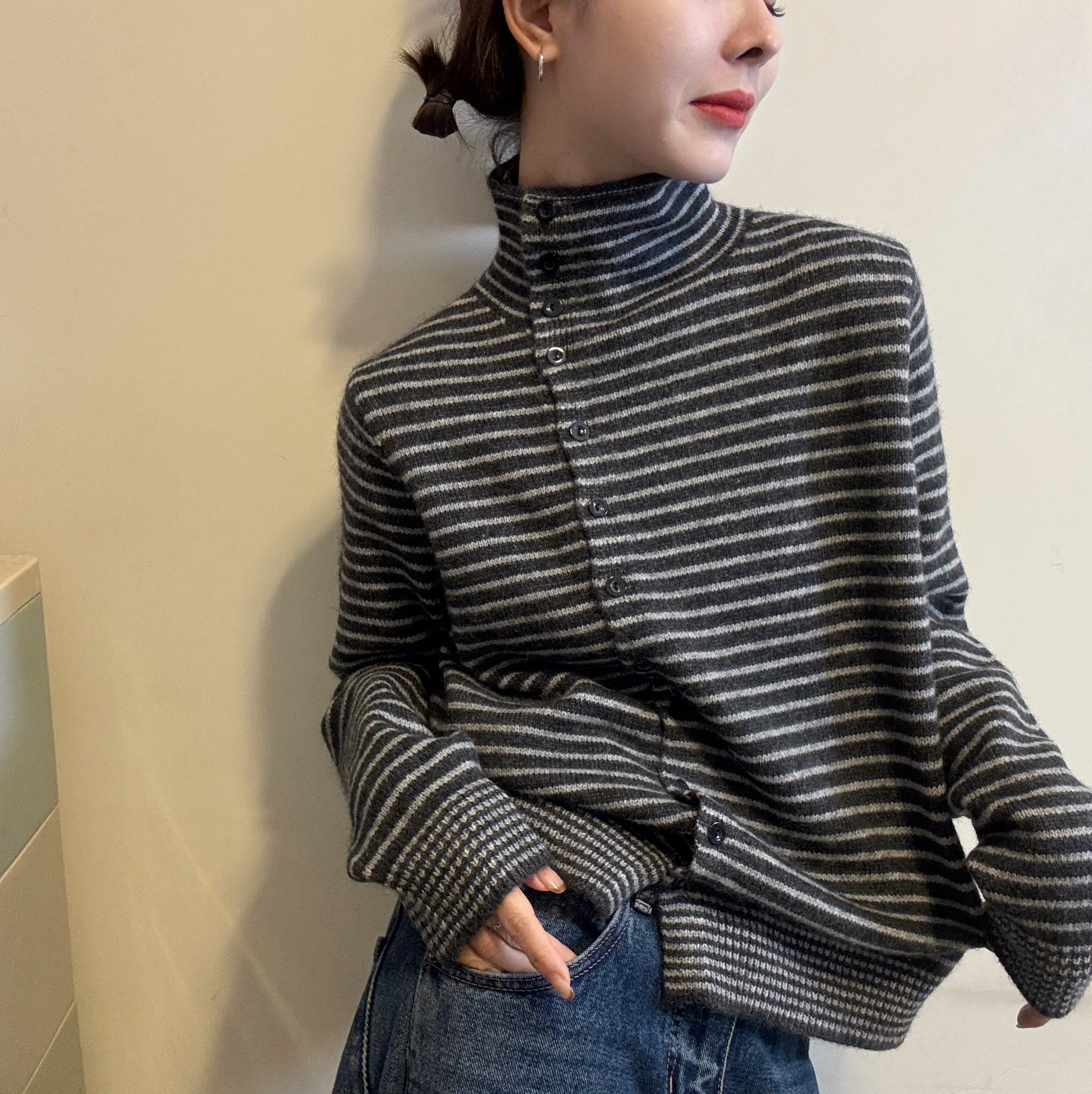 您的位置:他他商城  >   >  欧洲站2025冬季新款气质立领侧排扣设计细条纹拼色针织衫毛衣开衫