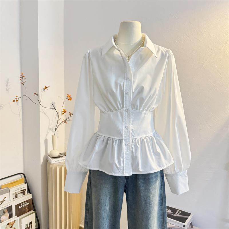 法式收腰白色衬衫女2025春新款显瘦设计感荷叶边长袖衬衣小衫上衣 - 莲妲旗舰店