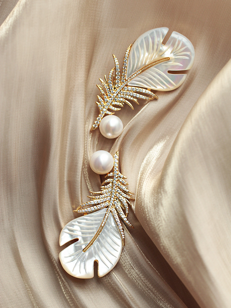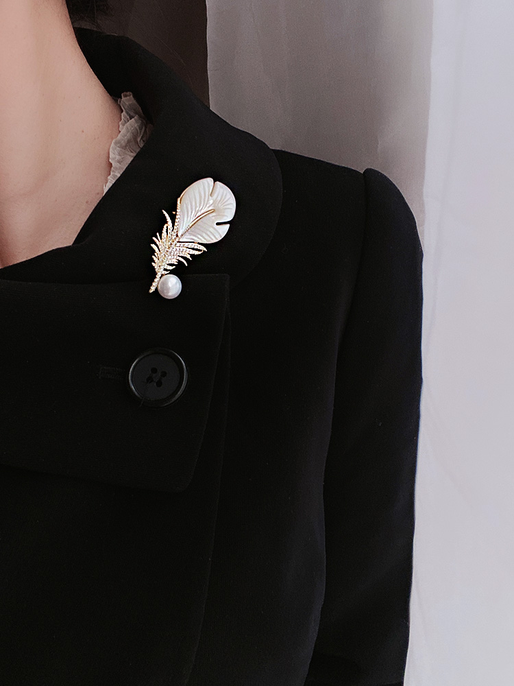奢华羽毛天然珍珠手雕白蝶贝显气质金色锆石贝壳胸针毛衣胸花礼物 - ZZJ做自己饰品设计