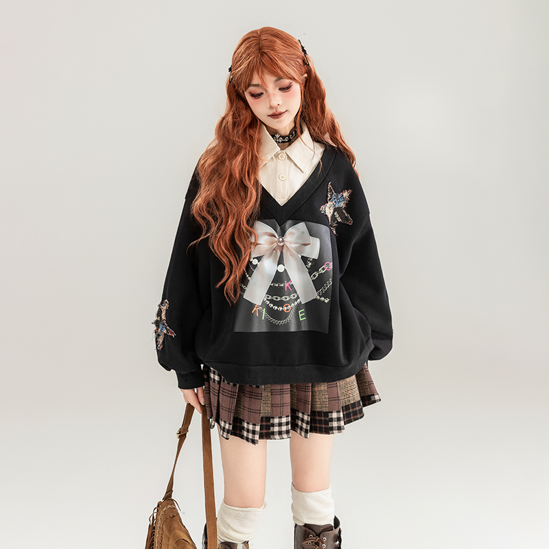 您的位置:他他商城  >   >  KEIKO [加密绒] 蝴蝶结印花假两件卫衣2025早秋设计感polo领外套