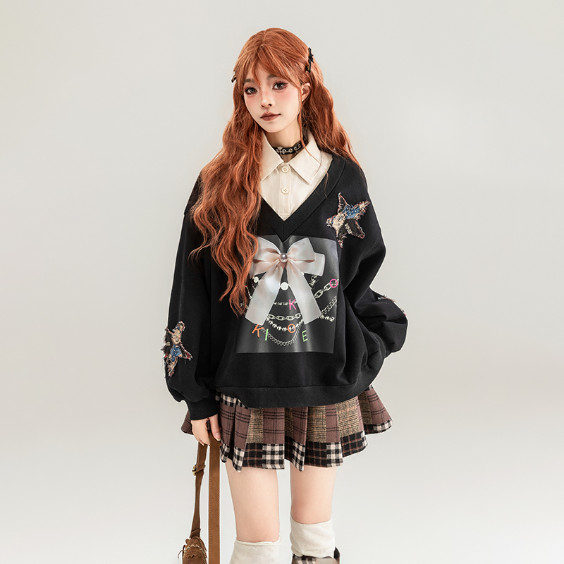 KEIKO [加密绒] 蝴蝶结印花假两件卫衣2025早秋设计感polo领外套 - 凯莉欧服饰旗舰店