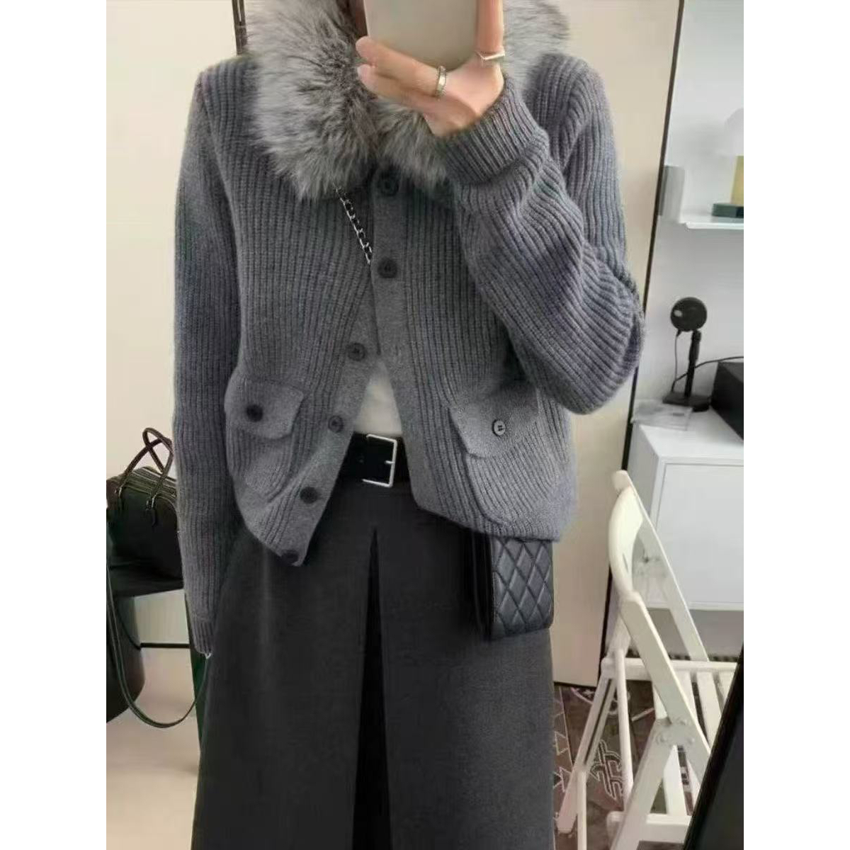 VI+(唯一家)-口袋翻领单排扣加厚保暖毛衣(配可拆卸仿毛领)5600
