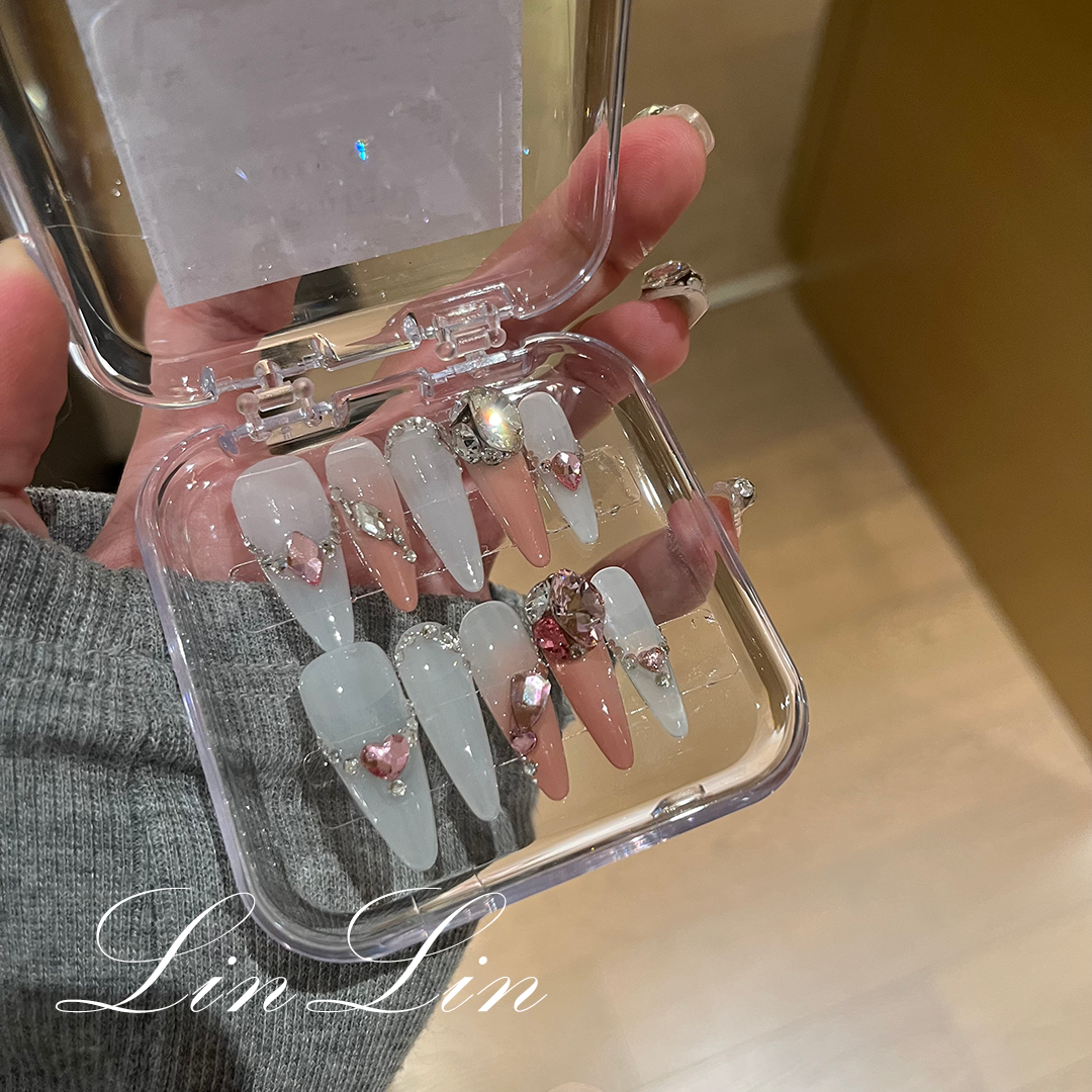 LinLin【甜茶】手工定制美甲ins东洲甜美裸色渐变钻长水滴穿戴甲