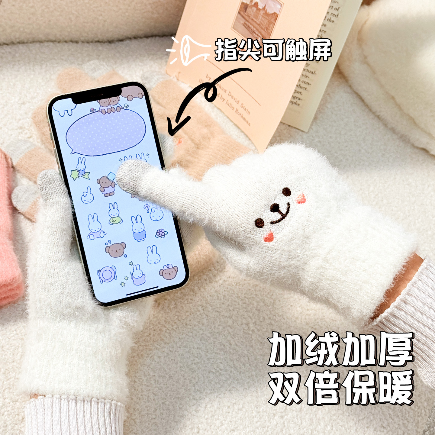 手套秋冬季女保暖学生韩版可爱加绒加厚骑车五指防寒可触屏棉手套
