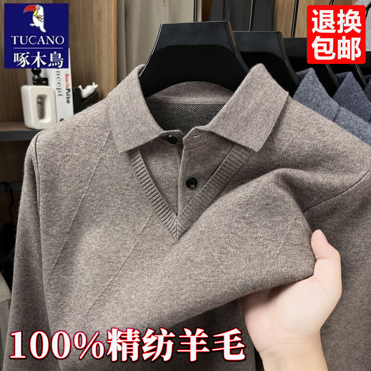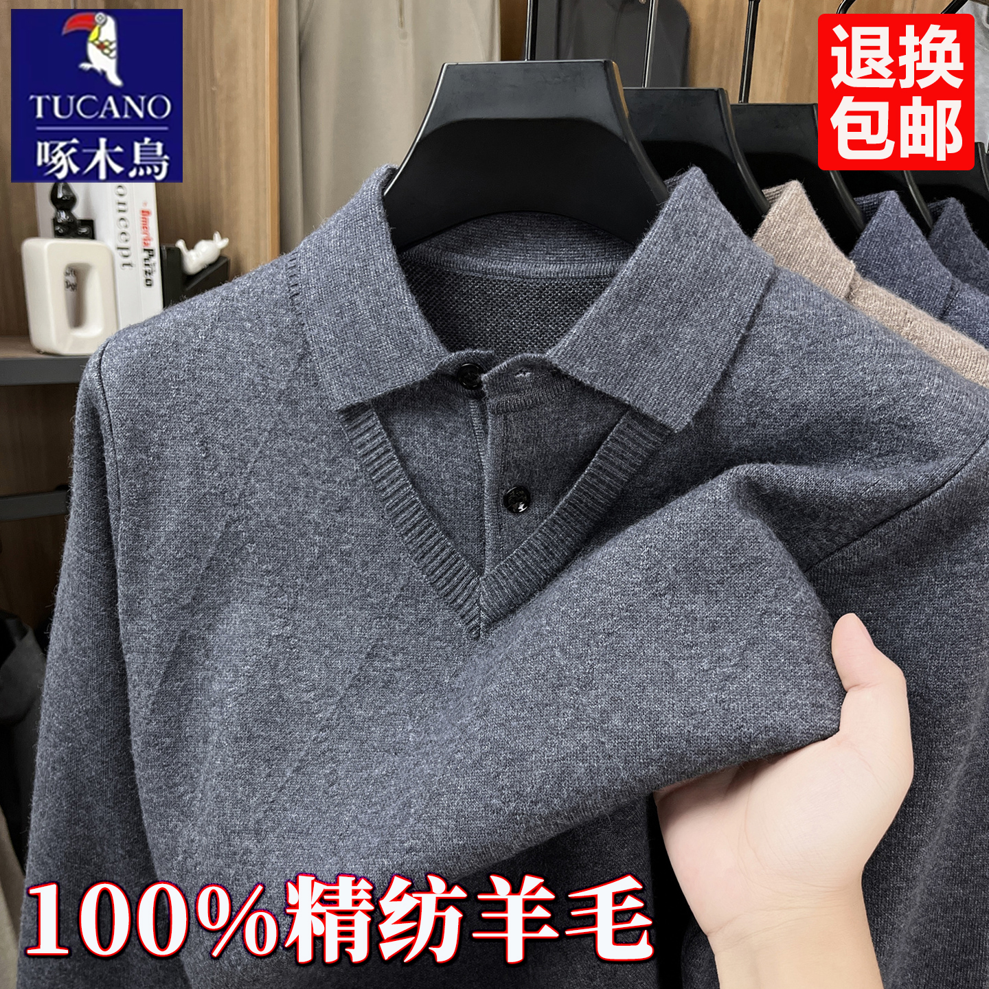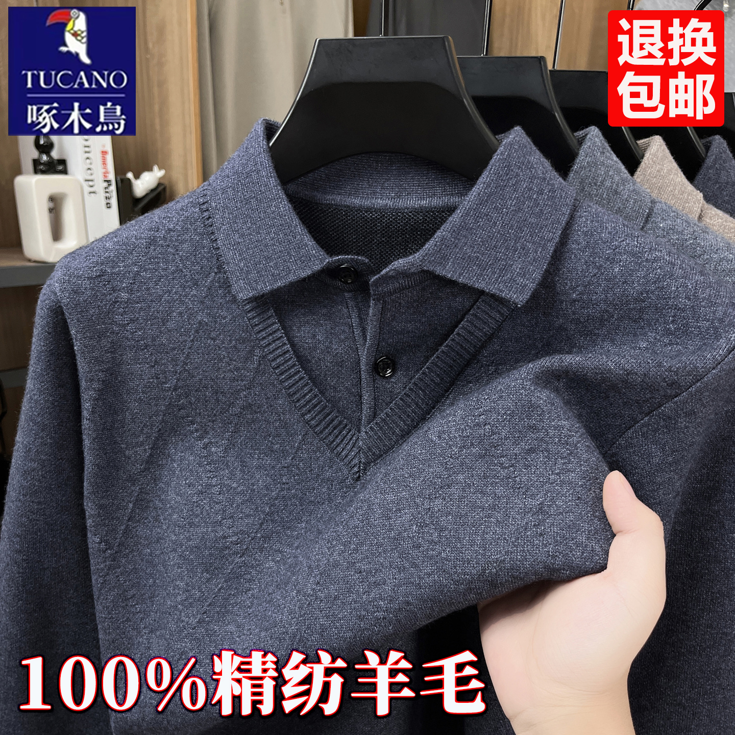 啄木鸟男士假两件羊毛衫翻领毛衣男冬季羊绒衫加绒加厚打底针织衫 - 啄木鸟总部男装分店
