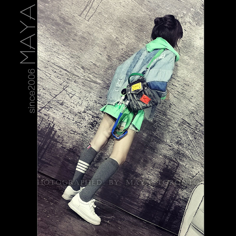 欧货2022新款牛仔布撞色小方包多功能双肩包链条时尚女单肩斜挎包 - 玛雅包馆
